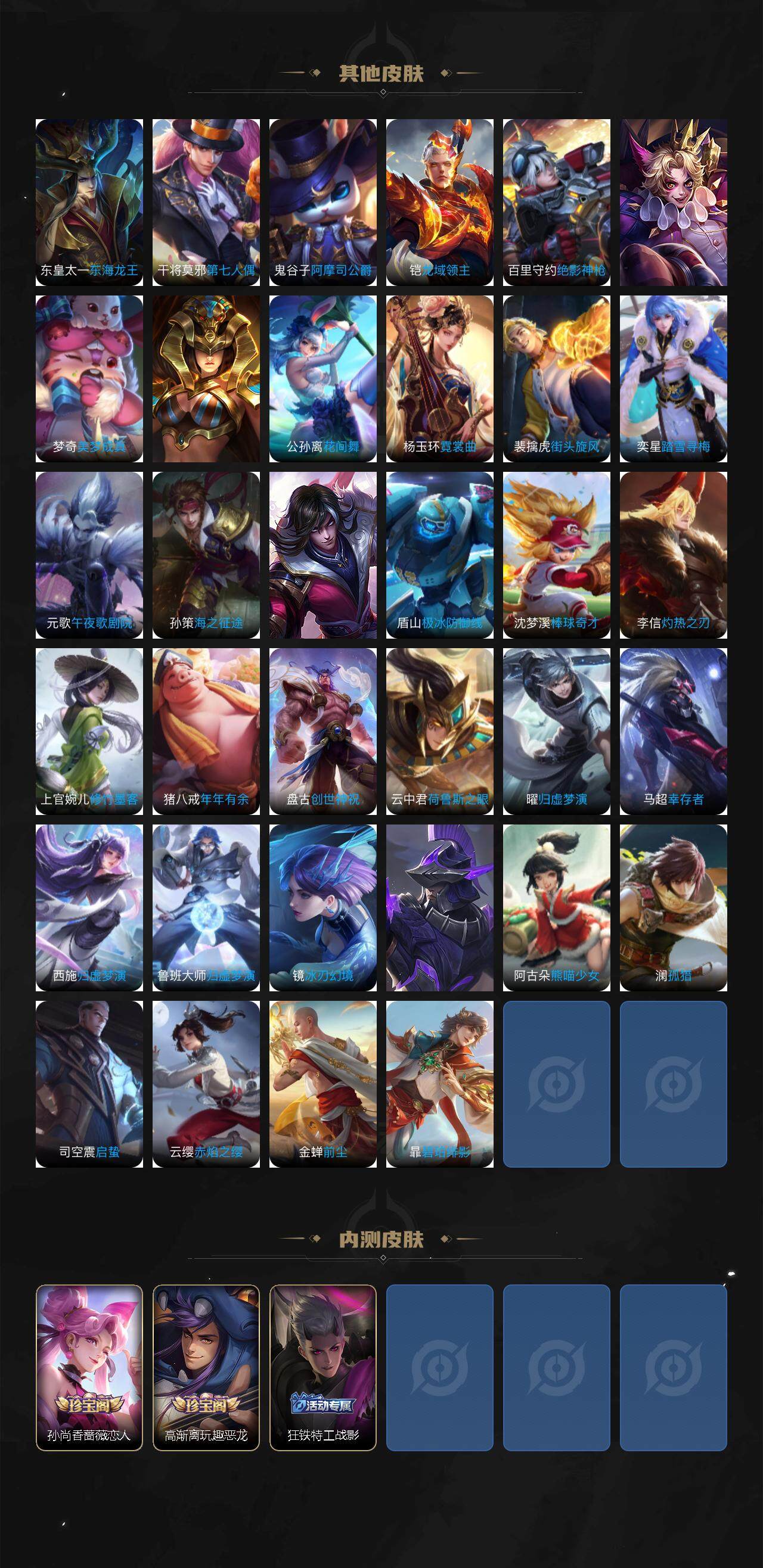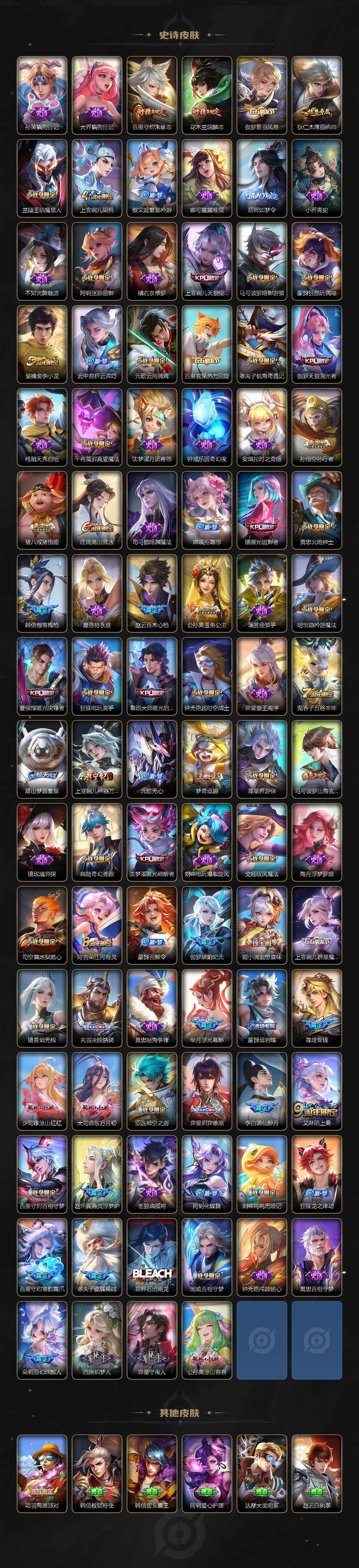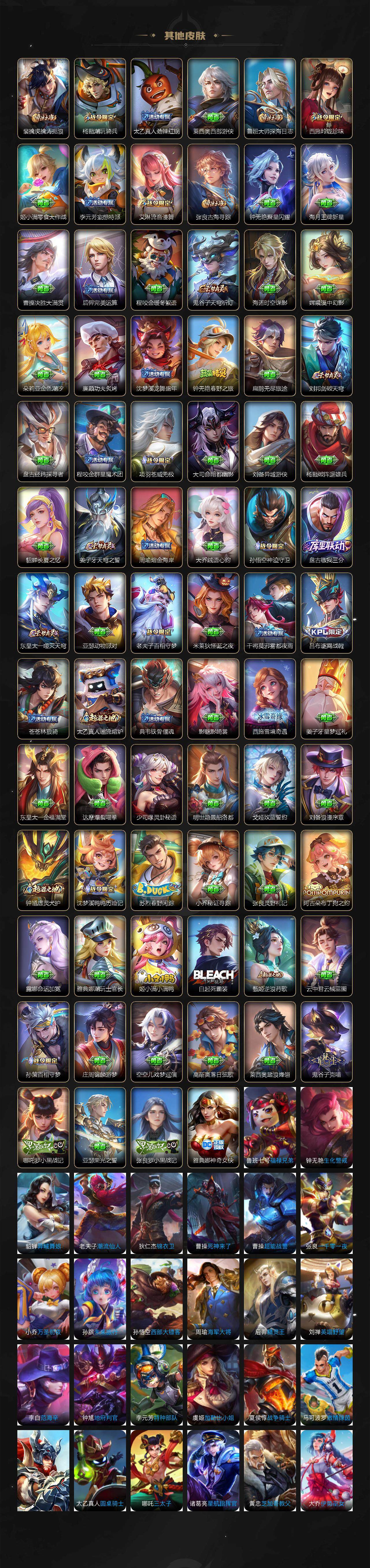 【限定皮肤】:暃埋骨钱,蒙犽顽岩魄,大乔绒语心约,姜子牙天穹之誓,杨戬破阵退雄兵,李白谪仙醉月,狄仁杰阴阳师,赵云皇家上将,赵云引擎之心,赵云百木心枪,墨子神迹守卫,孙尚香蔷薇恋人,孙尚香异界灵契,庄周高山流水,高渐离玩趣恶龙,阿轲迷踪丽影,钟无艳超时空战士,扁鹊奇幻香踪,白起夜都怪侠,芈月重明,芈月幻夜卜梦,周瑜赤莲之焰,元歌云间偶戏,元歌无心,夏侯惇朔风刀,夏侯惇匿光决锋者,甄姬落雪兰心,典韦穷奇,马可波罗暗影游猎,马可波罗山海玄木吟,狄仁杰魔术师,狄仁杰万华元夜,达摩沙漠行僧,项羽海滩派对,老夫子醍醐杖,老夫子航海奇遇记,关羽冰锋战神,程咬金演武夺筹,韩信逐梦之影,韩信傲雪梅枪,王昭君午后时光,兰陵王驯魔猎人,兰陵王金庭之子,花木兰青春决赛季,花木兰瑞麟志,花木兰燃星之曲,不知火舞绯月行,娜可露露前尘镜,橘右京枫霜尽,亚瑟潮玩骑士王,孙悟空至尊宝,孙悟空零号赤焰,孙悟空孙行者,牛魔御旌,后羿如梦令,后羿圣弓游侠,张飞百相守梦,李元芳云中旅人,虞姬启明星使,钟馗神迹守卫,钟馗驱傩正仪,杨玉环遇见飞天,杨戬潮玩骑兵,干将莫邪真爱魔法,干将莫邪画中仙,雅典娜单词大作战,蔡文姬繁星吟游,鬼谷