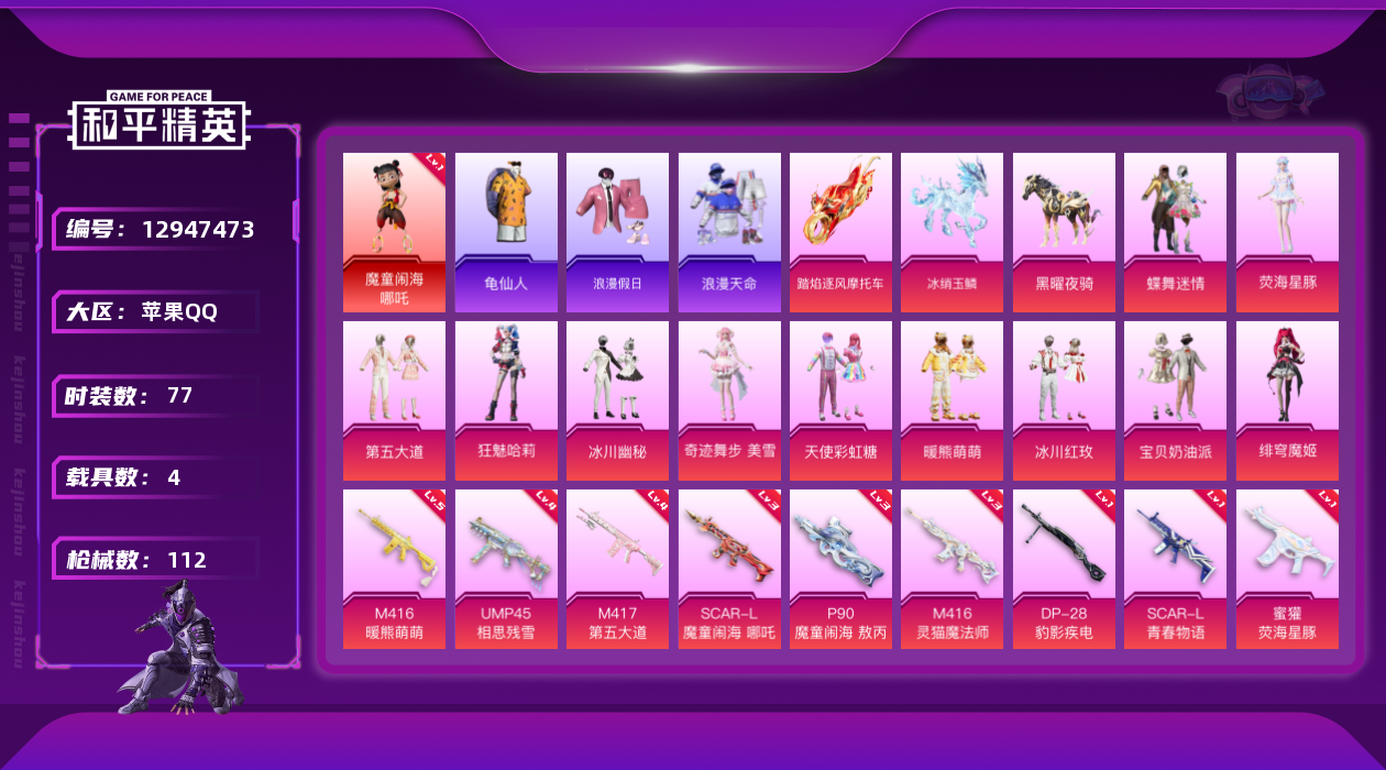 [12947473]【暑期末清货/特价急出/永久包赔】:苹果 手Q-1红装-12粉装-10特效枪-4载具-4w热力值-3印记-77套装-112枪皮【热门品类】:套装-小丑鱼【角色神装等级】:魔童闹海-哪吒(一级)【稀有载具】:踏焰逐风摩托车,僚机-冰龙团团,黑曜夜骑,冰绡玉鳞【特效枪等级】:SCAR-L-青春物语(一级),SCAR-L-魔童闹海 哪吒(三级),M416-暖熊萌萌(五级),M416-灵猫魔法师(三级),蜜獾-荧海星豚(一级),UMP45-相思残雪(四级),P90-魔童闹海 敖丙(三级),M417-第五大道(四级),DP-28-豹影疾电(一级),平底锅-仲夏莫吉托(一级)【优质套装】:粉装-宝贝奶油派,粉装-天使彩虹糖,粉装-蝶舞迷情,粉装-梦幻火箭,粉装-暖熊萌萌,粉装-冰川幽秘,粉装-冰川红玫,粉装-第五大道,角色-狂魅哈莉,角色-荧海星豚,角色-绯穹魔姬,角色-奇迹舞步 美雪【优质飞行器】:春暖花开飞行器,梦幻火箭飞行器,双重狂想飞行器,灵猫魔法师飞行器,飞天猪飞行器,灵珠游龙飞行器