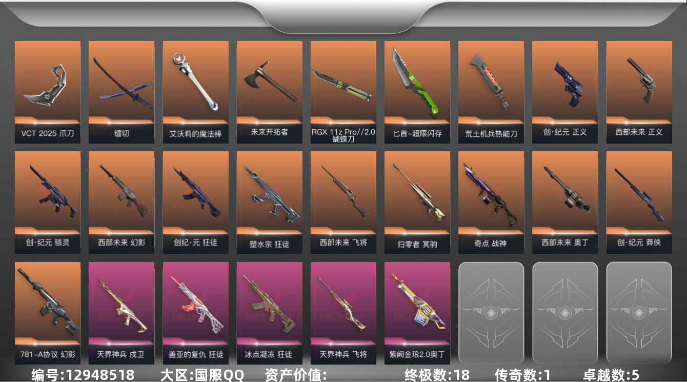 [12948518]皮肤资产价值44320 【套装】:VCT 2025 赛季套装,西部未来套装,创·纪元套装 【英雄】:幻棱,炼狱,维斯,暮蝶,钛狐,壹决,铁臂,捷风,雷兹,幽影,不死鸟,贤者,猎枭,蝰蛇,零,芮娜,奇乐,尚勃勒,霓虹,斯凯,夜露,星礈,K/O,盖可,黑梦 【近战 武器】:近战武器-RGX 11z Pro//2.0 蝴蝶刀,近战武器-VCT 2025 爪刀,近战武器-镭切,近战武器-艾沃莉的魔法棒,近战武器-未来开拓者,近战武器-超限闪存 匕首,近战武器-荒土机兵 热能刀 【狂徒】:狂徒-塑水宗,狂徒-创·纪元,狂徒-冰点凝冻,狂徒-盖亚的复仇,狂徒-荒土机兵,狂徒-诡秘蛇影 【幻影】:幻影-781-A协议,幻影-西部未来,幻影-超限闪存,幻影-神圣领域,幻影-纳米打击,幻影-西部未来 【戍卫】:戍卫-天界神兵,戍卫-浮光跃金,戍卫-逆冲蛮牛,戍卫-折光棱晶 【獠犬】:獠犬-模拟赫兹,獠犬-逆冲蛮牛 【冥驹】:冥驹-归零者,冥驹-荒土机兵,冥驹-模拟赫兹 【飞将】:飞将-西部未来,飞将-天界神兵,飞将-末日之翼 【莽侠】:莽侠-创·纪元,莽侠-超限闪存,莽侠-诡秘蛇影,莽侠-月球哨兵 【战神】:战神-奇点,战神-神圣领域,战神-浮光跃金 【奥丁】:奥丁-西部未来,奥丁-紫阙金琅//2.0,奥丁-纳米打击,奥丁-末日之翼 【判官】:判官-诡秘蛇影,判官-纳米打击x,判官-神罚 【雄鹿】:雄鹿-模拟赫兹,雄鹿-逆冲蛮牛,雄鹿-月球哨兵 【骇灵】:骇灵-创·纪元,骇灵-荒土机兵,骇灵-浮光跃金,骇灵-星云暗涌 【蜂刺】:蜂刺-超限闪存,蜂刺-星云暗涌,蜂刺-折光棱晶 【标配】:标配-超能偶像,标配-荒土机兵,标配-浮光跃金,标配-折光棱晶 【正义】:正义-创·纪元,正义-西部未来,正义-超限闪存,正义-纳米打击,正义-月球哨兵 【鬼魅】:鬼魅-流星兵团,鬼魅-模拟赫兹 【狂怒】:狂怒-神圣领域,狂怒-逆冲蛮牛 【短炮】:短炮-末日之翼 【卡面】:进入射程 卡面,分崩离析 卡面,纳米打击 卡面,抑制技术 卡面,激斗汉堡 卡面,瓦娃脸雪糕 P2 卡面,从黄昏到黎明 卡面,荒土机兵 卡面,银弹猎手 卡面,逆冲蛮牛 卡面,精灵大战 卡面,南瓜盛典 卡面,唱片的故事 卡面,钢弓与箭弦 卡面,排除故障 卡面,战术桌游 卡面,悠享食光 卡面,修车达人 卡面,模拟赫兹 卡面,浮光跃金 卡面
