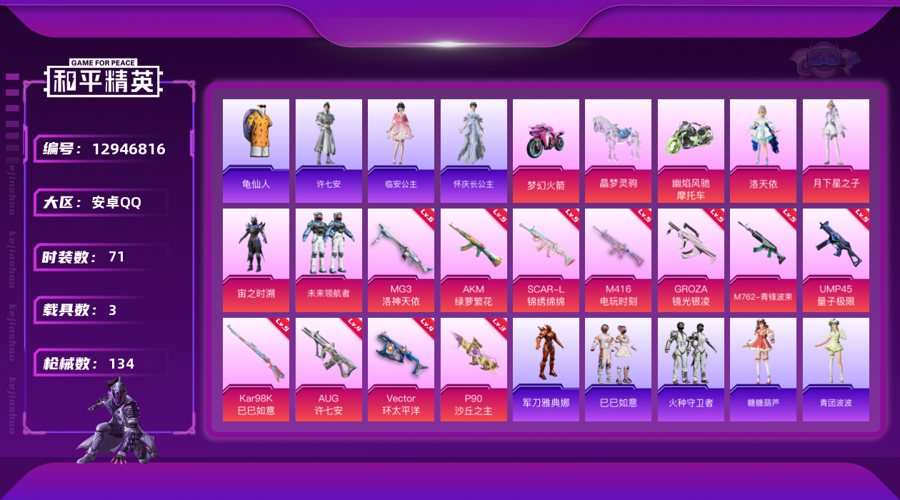 [12946816]【暑期末清货/特价急出/永久包赔】:安卓 手Q-4粉装-11特效枪-3载具-4.5w热力值-8印记-71套装-134枪皮【热门品类】:角色-军刀雅典娜【稀有载具】:双人摩托-梦幻火箭,幽焰风驰摩托车,晶梦灵驹【特效枪等级】:AKM-绿萝繁花(五级),SCAR-L-锦绣绵绵(五级),M416-电玩时刻(五级),GROZA-镜光银凌(五级),AUG-许七安(四级),M762-青锋波束(五级),UMP45-量子极限(五级),Vector-环太平洋(四级),P90-沙丘之主(三级),Kar98K-巳巳如意(五级),MG3-洛神天依(六级)【优质套装】:角色-洛天依,角色-宙之时溯,粉装-未来领航者,角色-月下星之子【优质飞行器】:酣梦熊熊飞行器,沙丘之主天马,镜域双华-灵镜之阶,龙翔九天飞行器,深渊漩涡飞行器,凤舞九天飞行器