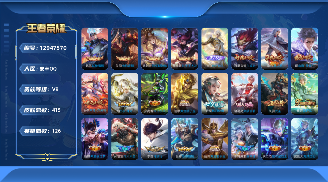 [12947570]【暑期末清货/特价急出/永久包赔】:安卓Q-V9-最强王者段位-126英雄-415皮肤-4典藏-1无双-0珍品传说-21传说-120史诗