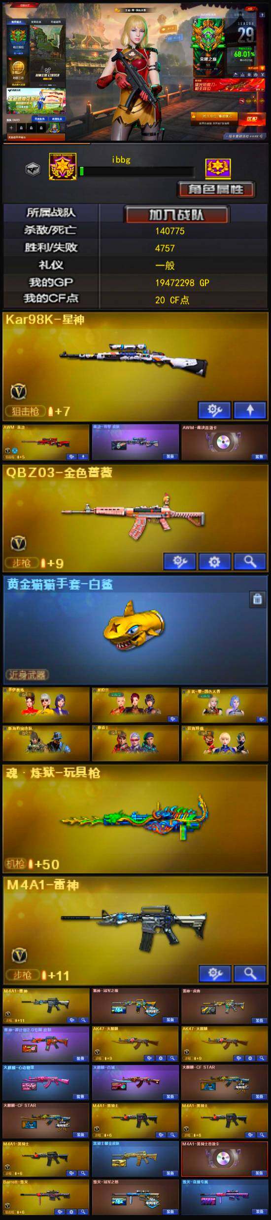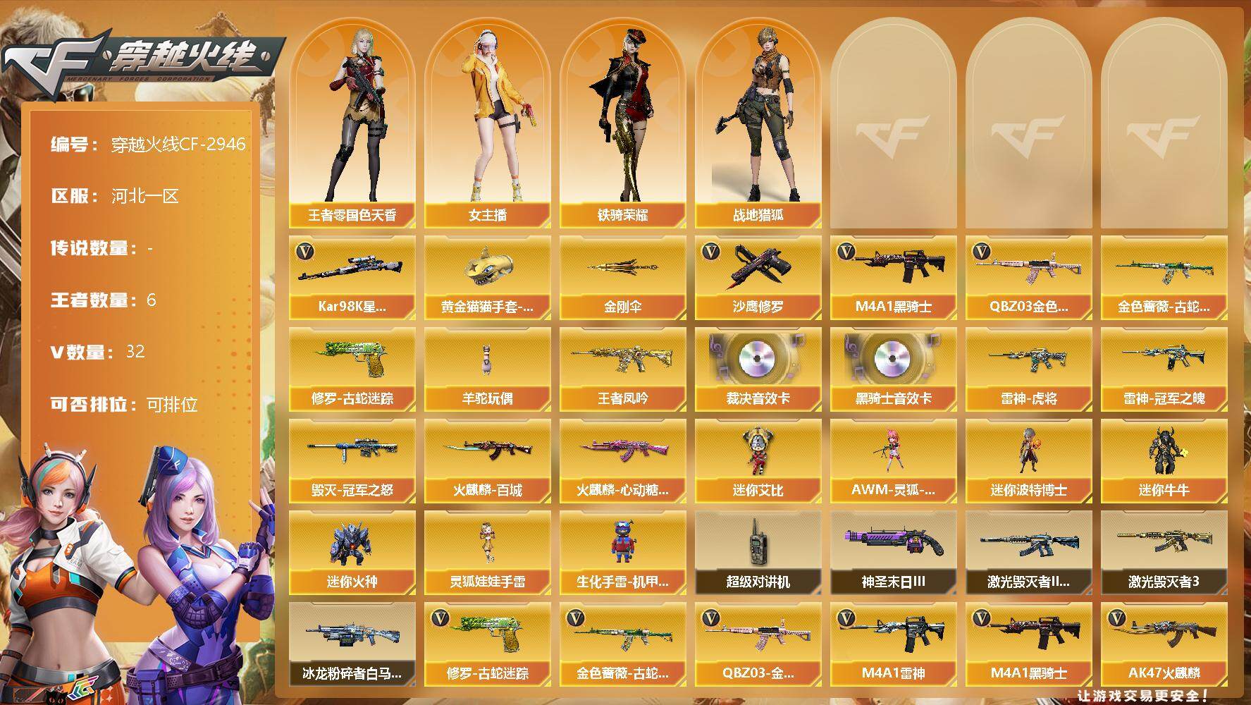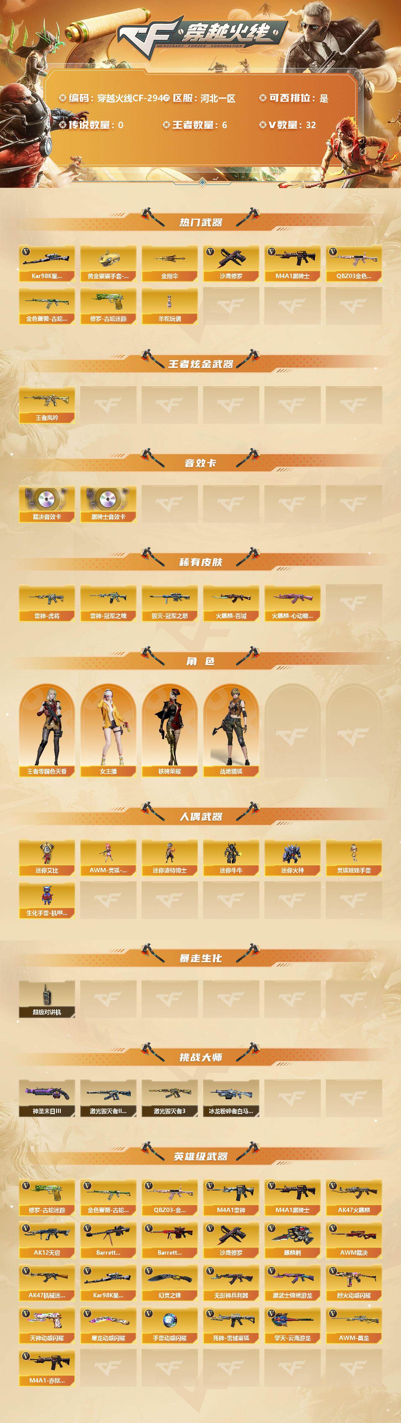 [12946792]河北一区-32V-6王者-0炫金 【热门武器】:QBZ03-金色蔷薇,金色蔷薇-古蛇迷踪,修罗-古蛇迷踪,Kar98K-星神,M4A1-黑骑士*3,羊驼玩偶,沙鹰-修罗*4,黄金猫猫手套-白鲨,金刚伞 【王者炫金武器】:王者凤吟 【音效卡】:M4A1-黑骑士音效卡,AWM-裁决音效卡 【稀有皮肤】:雷神-虎将,雷神-冠军之魄,火麒麟-百城,火麒麟-心动糖果,毁灭-冠军之怒 【角色】:王者-零-国色天香,战地猎狐,女主播,铁骑荣耀 【人偶武器】:AWM-灵狐-15周年嘉年华*2,迷你艾比,迷你波特博士,迷你牛牛,迷你火种,灵狐娃娃手雷,生化手雷-机甲核心*2 【暴走生化】:超级对讲机 【挑战大师】:神圣爆裂者-末日III,激光毁灭者III,激光毁灭者III-白马银枪,冰龙粉碎者-白马银枪 【英雄级武器】:幻灵之锋,烈火-动感闪耀,天神-动感闪耀,屠龙-动感闪耀,手雷-动感闪耀,QBZ03-金色蔷薇,金色蔷薇-古蛇迷踪,无影-神兵利器,M4A1-雷神*2,M4A1-黑骑士*3,AK47-火麒麟*2,AK12-天启,Barrett-毁灭,Barrett-极光,AWM-裁决,AK47-机械迷城,Kar98K-星神,黑武士-锦绣游龙,死神-雪域霜狐,AWM-昌龙,M4A1-赤狱骑士,修罗-古蛇迷踪,沙鹰-修罗*4,麒麟刺*2,擎天-云海游龙 【特殊枪械】:3黑骑士