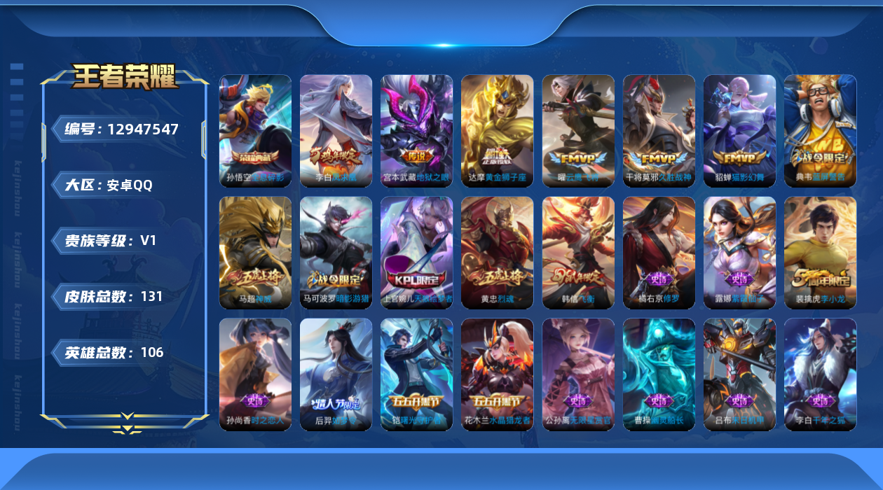 [12947547]【暑期末清货/特价急出/永久包赔】:安卓Q-V0-荣耀黄金II段位-103英雄-131皮肤-1典藏-6传说-37史诗