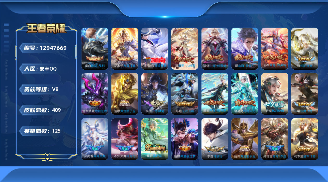 - [11657222]V8 1典藏 4无双 7珍品传说 40传说 105英雄 174皮肤 可修改实名 优质装备:银白咏叹调(倪克斯侍卫),韩信群星魔术团(韩信无双),花合斗,离恨烟(公孙离无双),器灵·螭龙剑,江户川柯南,怪盗基德,器灵·落星盏,酷洛米之心,大耳狗之梦,云鹰飞将(小将军),绛天战甲(鸡嘴战神),黄金白羊座,久胜战神,一念神魔,云霓雀翎,零号·赤焰,海洋之心,音你心动-周瑜,挚爱之约,无双飞将,山海·炽霜斩(李信年限),燃星之曲,浮生妄,妄想实况,妄想奇谈,澜逐花归海,黄金天蝎座,玄雷天君,涂山容容 珍品传说:时之奇旅-孙策,兔狲·蓬尾 传说皮:吕布曦玄引,云诺千山,铠冥王哈迪斯,续相思,星之鸣奏,祥瑞亨通,幻光神枪 珍宝阁皮:万物之道 限定皮:愿照·九州拓(澜年限),愿照·福禄聚(蔡文姬年限),愿照·岁时盈(虞姬年限),愿照·山河定(司空震年限),愿照·众生和(妲己年限),愿照·千秋盛(女娲年限),逐霄战戟,映山客,陌上桑,鸣野蒿,夏侯惇霜北刀,时雨天司(水龙头),诗剑行,怒海麟威,御风骁将(吕布年限),引擎之心,启示之音,冰霜神祇 史诗皮:鸭鸭历险记-刘禅,苍鳞隐世,器灵·浮梦炉,糖绘人间,狼魂孤将,绮世丹青,瑰影绮梦,化蝶舞,谪仙醉月,龙之律动,藏狐·褐绒,布丁狗之誓,茶境仙,怒海争锋,炽弈燎原,破空之剑,战舞者,东方月初,蒙犽顽岩魄,埋骨钱,海诺心动手记,百相守梦-百里守约,星界特工,百相守梦-黄忠,特工魅影,冰冠公主,青蛇,偶像歌手,暗夜猫娘,女仆咖啡,水果甜心,星夜王子,功夫厨神,鬼剑武藏,天秀·启明,地狱岩魂,缤纷独角兽,乘风破浪,逐浪之夏,月团寄思,水晶猎龙者,曙光守护者,金属风暴,圣诞恋歌,鹰眼统帅,魅力维加斯,赏金猎手,未来纪元-赵云