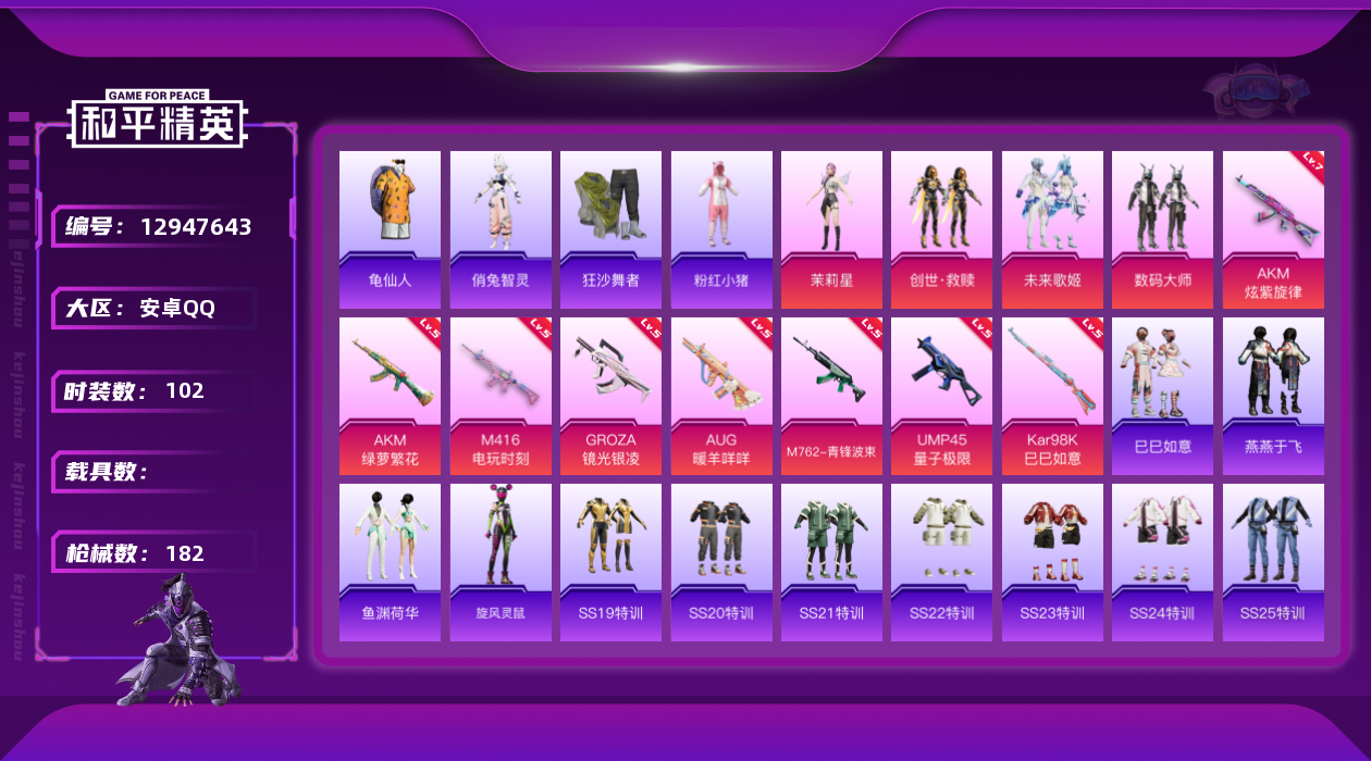 - PX_2106741- 安卓手Q-4王牌印记-8粉装-10特效枪-2载具-73135热力值-183套装-215枪皮-0卓越印记-0传奇印记 【8粉装】,梦幻火箭,幻彩电音,蓝莓炮弹,璀璨巨星,萨利娅,锦绣火鲤,吟月归客,金丰海韵 【10特效枪】AKM-炫紫旋律-7级 M416-风花雪月-4级 AUG-暖羊咩咩-3级 Famas-初号机 觉醒Ver.-5级 Kar98K-巳巳如意-3级 Kar98K
