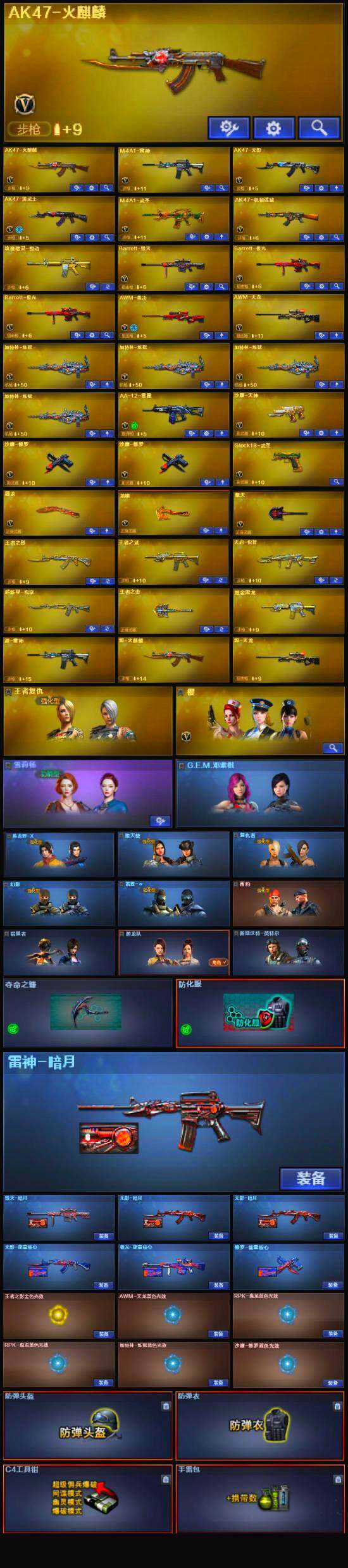 【英雄级武器】:AK47-火麒麟*2,M4A1-雷神,AK47-无影,AK47-黑武士,M4A1-武圣,AK47-机械迷城,AWM-天龙,Barrett-毁灭,Barrett-极光*2,AWM-裁决,加特林-炼狱*4,AA-12-雷霆,沙鹰-修罗*2,沙鹰-天神,Glock18-武圣,屠龙,龙啸,擎天