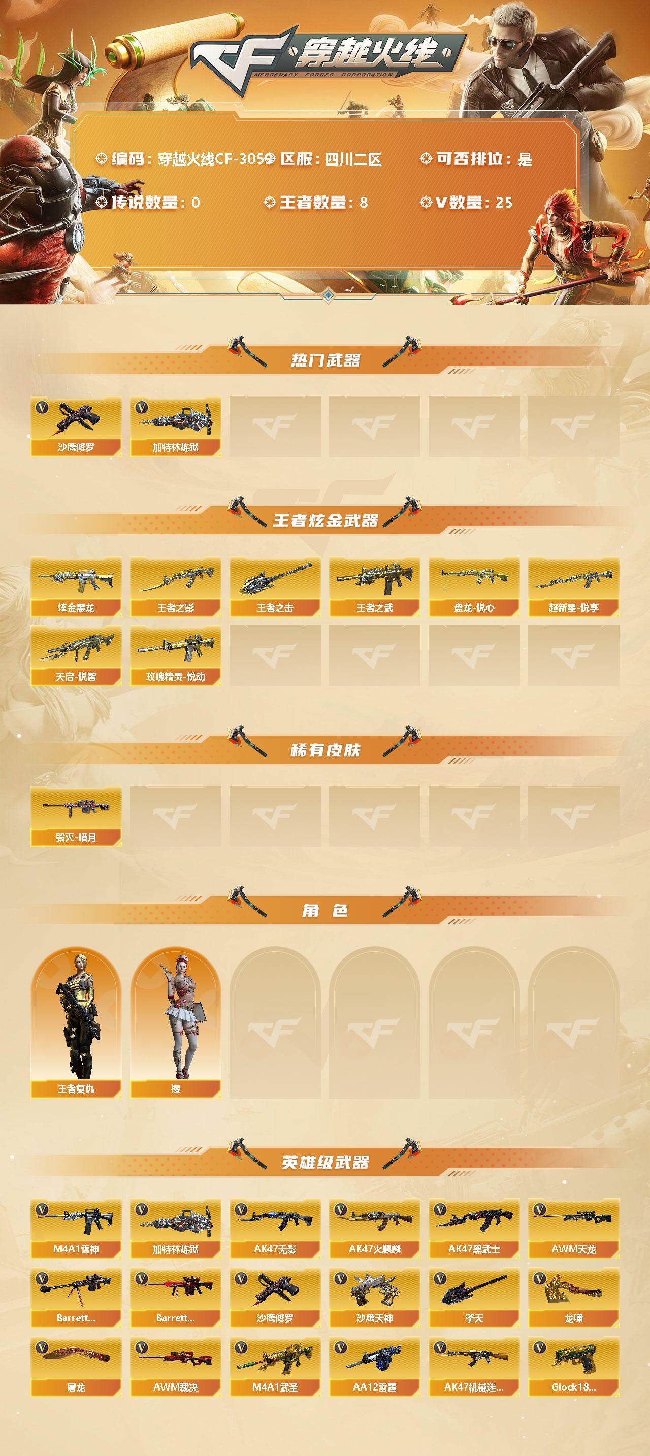 [12948015]四川二区-25V-8王者-1炫金 【热门武器】:加特林-炼狱*4,沙鹰-修罗*2 【王者炫金武器】:超新星-悦享,天启-悦智,王者之武,玫瑰精灵-悦动,王者之影,盘龙-悦心,王者之击,炫金黑龙 【稀有皮肤】:毁灭-暗月 【角色】:樱,王者复仇 【英雄级武器】:AK47-火麒麟*2,M4A1-雷神,AK47-无影,AK47-黑武士,M4A1-武圣,AK47-机械迷城,AWM-天龙,Barrett-毁灭,Barrett-极光*2,AWM-裁决,加特林-炼狱*4,AA-12-雷霆,沙鹰-修罗*2,沙鹰-天神,Glock18-武圣,屠龙,龙啸,擎天 【特殊枪械】:4炼狱