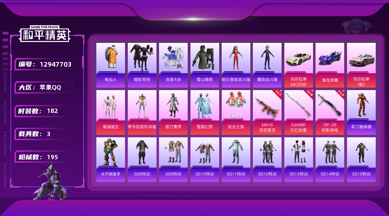 [12947703]【暑期末清货/特价急出/永久包赔】:苹果 手Q-5粉装-3特效枪-3载具-6.9w热力值-17印记-182套装-195枪皮【热门品类】:绝对防御上衣,套装-奇异狩猎者,角色-军刀雅典娜【稀有载具】:玛莎拉蒂MC20(星石白),玛莎拉蒂Ghibli(粉),海龙奔腾【特效枪等级】:M416-风花雪月(七级),Kar98K-巳巳如意(五级),DP-28-豹影疾电(三级)【优质套装】:粉装-雪国幻梦,粉装-银刃赛罗,粉装-海渊国主,角色-零号机款机体服,粉装-炫光之旅【优质飞行器】:精灵迷巫飞行器,千面幻镜飞行器