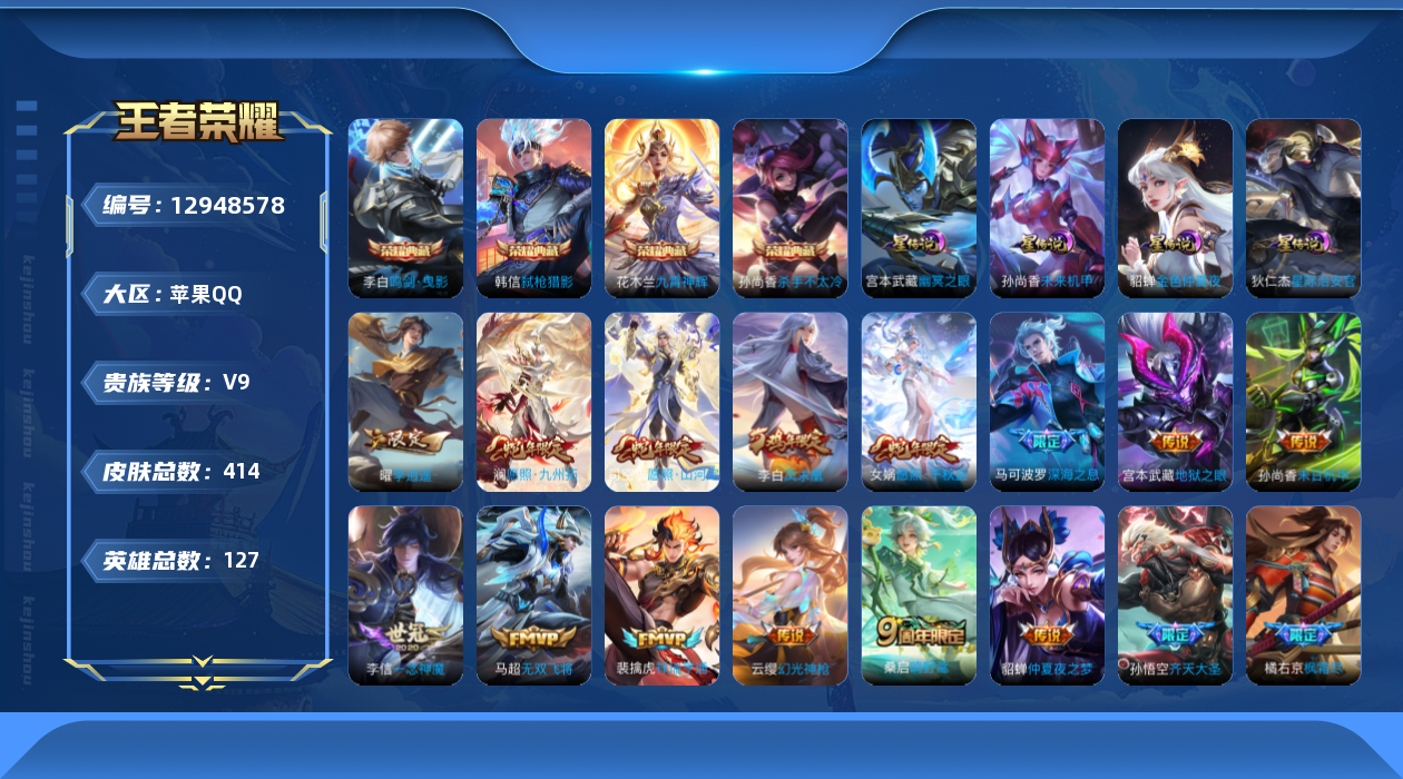 [12948578]【特价急出/详情看图】苹果Q-V9-至尊星耀II段位-127英雄-414皮肤-4典藏-22传说-4星元-116史诗 【英雄全皮】:阿轲全皮,钟馗全皮,司空震全皮,空空儿全皮,影全皮 【荣耀典藏】:孙尚香杀手不太冷,李白鸣剑曳影,花木兰九霄神辉,韩信弑枪猎影 【传说皮肤】:司空震愿照山河定,女娲愿照千秋盛,澜愿照九州拓,云缨幻光神枪,裴擒虎祥瑞亨通,桑启鸣野蒿,项羽无限倾心,伽罗炽翼辉光,孙悟空齐天大圣,橘右京枫霜尽,马可波罗深海之息,马超无双飞将,曜李逍遥 ,虞姬启明星使,李信一念神魔,后羿黄金射手座,貂蝉仲夏夜之梦,李白凤求凰,孙尚香末日机甲,宫本武藏地狱之眼,孙悟空地狱火,狄仁杰超时空战士 【限定皮肤】:白起狰,蒙犽顽岩魄,蔡文姬夏日便利店,大乔绒语心约,虞姬夏日便利店,姜子牙天穹之誓,狄仁杰阴阳师,赵云皇家上将,赵云引擎之心,墨子神迹守卫,嬴政优雅恋人,嬴政白昼王子,鲁班七号狮舞东方,庄周高山流水,阿轲迷踪丽影,钟无艳超时空战士,吕布猎兽之王,吕布御风骁将,周瑜赤莲之焰,元歌云间偶戏,元歌无心,夏侯惇朔风刀,甄姬游园惊梦,曹操烛龙,典韦蓝屏警告,马可波罗深海之息,狄仁杰魔术师,狄仁杰万华元夜,达摩星际陆战队,达摩沙漠行僧,项羽海滩派对,项羽无限倾心,老夫子醍醐杖,老夫子航海奇遇记,安琪拉魔法小厨娘,程咬金演武夺筹,兰陵王驯魔猎人,兰陵王金庭之子,花木兰默契交锋,橘右京枫霜尽,亚瑟潮玩骑士王,孙悟空齐天大圣,李元芳银河之约,李元芳云中旅人,虞姬启明星使,钟馗神迹守卫,钟馗驱傩正仪,杨玉环遇见飞天,女娲朔望之晖,哪吒逐梦之翼,干将莫邪冰霜恋舞曲,雅典娜单词大作战,雅典娜黎明之约,蔡文姬繁星吟游,太乙真人饕餮,鬼谷子原初探秘者,鬼谷子五谷丰年,铠青龙志,苏烈千军破阵,百里玄策原初追逐者,百里守约朱雀志,弈星混沌棋,沈梦溪星空之诺,沈梦溪大漠名商,沈梦溪匿光破解者,明世隐疑决卦,裴擒虎天狼狩猎者,裴擒虎李小龙,裴擒虎擒涛扼浪,狂铁御狮,米莱狄御霄,米莱狄胡桃异想国,云中君纤云弄巧,云中君时之祈愿,伽罗天狼溯光者,伽罗炽翼辉光,盾山御銮,猪八戒猪悟能,上官婉儿梁祝,嫦娥拒霜思,曜李逍遥 ,西施玲珑珍味,蒙犽狂想玩偶喵,鲁班大师探海日志,镜匿光追影者,桑启海盐诗旅,艾琳流音漫舞,司空震地狱燃心,阿古朵江河有灵,张良古海寻踪,裴擒虎梅西,蒙犽百解令,高渐离燃音魔法,妲己灵