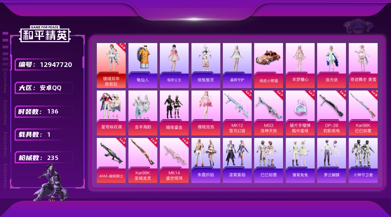 [12947720]【暑期末清货/特价急出/永久包赔】:安卓 手Q-1红装-8粉装-8特效枪-1载具-7.6w热力值-16印记-136套装-235枪皮【热门品类】:套装-S1赛事【角色神装等级】:镜域双华-欧若拉(三级)【稀有载具】:俏皮小熊猫【特效枪等级】:AKM-幽焰骑士(三级),Kar98K-巳巳如意(五级),Kar98K-圣域龙灵(三级),Mk14-盛世惊鸿(三级),MK12-雪月幻音(七级),DP-28-豹影疾电(五级),MG3-洛神天依(七级),破片手榴弹-瓶中星球(七级)【优质套装】:粉装-梦幻火箭,角色-洛天依,粉装-暗夜鎏金,粉装-金丰海韵,角色-樱桃泡泡,粉装-星穹咏叹调,角色-奇迹舞步 美雪,角色-羊梦糖心【优质飞行器】:梦幻火箭飞行器,镜域双华-灵镜之阶,龙翔九天飞行器,凤舞九天飞行器,圣域金龙飞行器,绯果甜心飞行器,灵猫魔法师飞行器,飞天猪飞行器