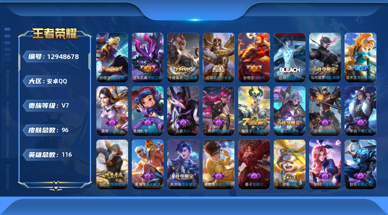 [12948678]【特价急出/详情看图】:安卓Q-V7-尊贵铂金I段位-116英雄-96皮肤-1典藏-4传说-35史诗
