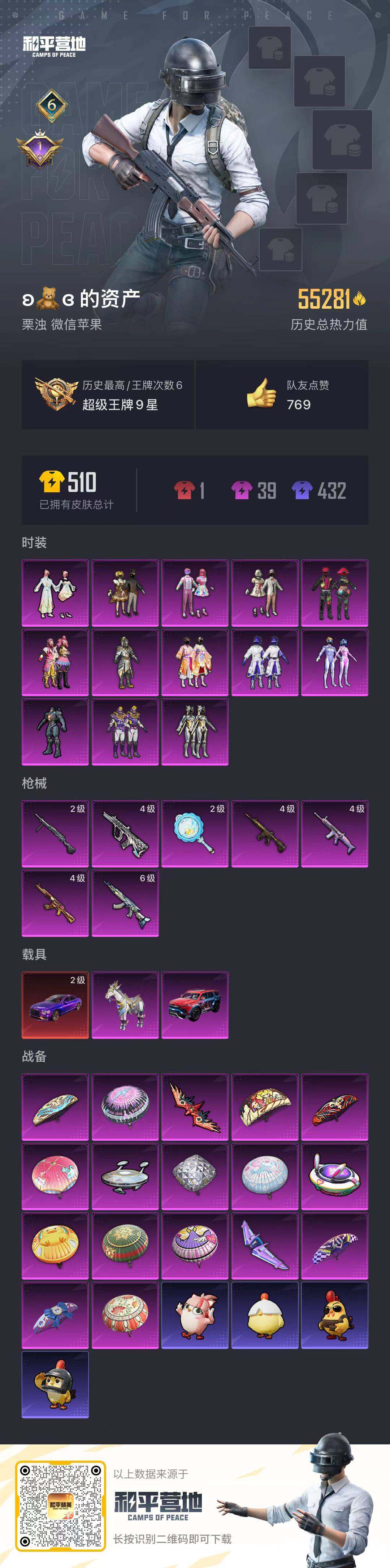 [12947687]带王者V8-267皮肤1典藏1珍品22传说/巧克力三姐妹/小白龙/2级宾利/猪妹/放客/苹果 微信-13粉装-7特效枪-3载具-4粉色飞行器-55281热力值-6王牌印记-102套装-143枪皮