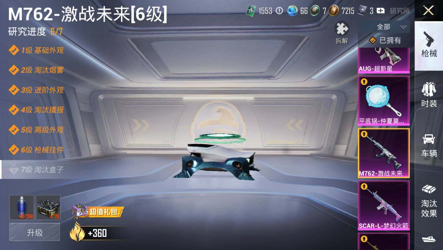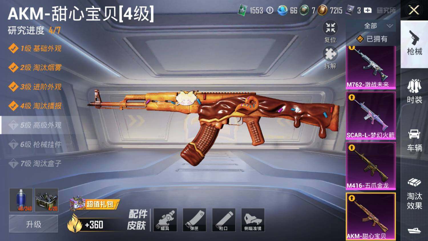 AKM-甜心宝贝,SCAR-L-梦幻火箭,M416-五爪金龙,AUG-超新星,M762-激战未来,平底锅-仲夏莫吉托