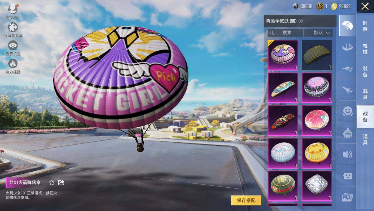 【粉色降落伞】:甜心宝贝降落伞,梦幻火箭降落伞,锦绣火鲤降落伞,童趣迷兔降落伞,王牌四分卫降落伞,垂柳戏鸭降落伞,翩跹演武降落伞,彩虹甜喵降落伞,千面幻镜降落伞,旋转彩虹降落伞,炎氏战神降落伞,超新星降落伞,龙行天下降落伞
