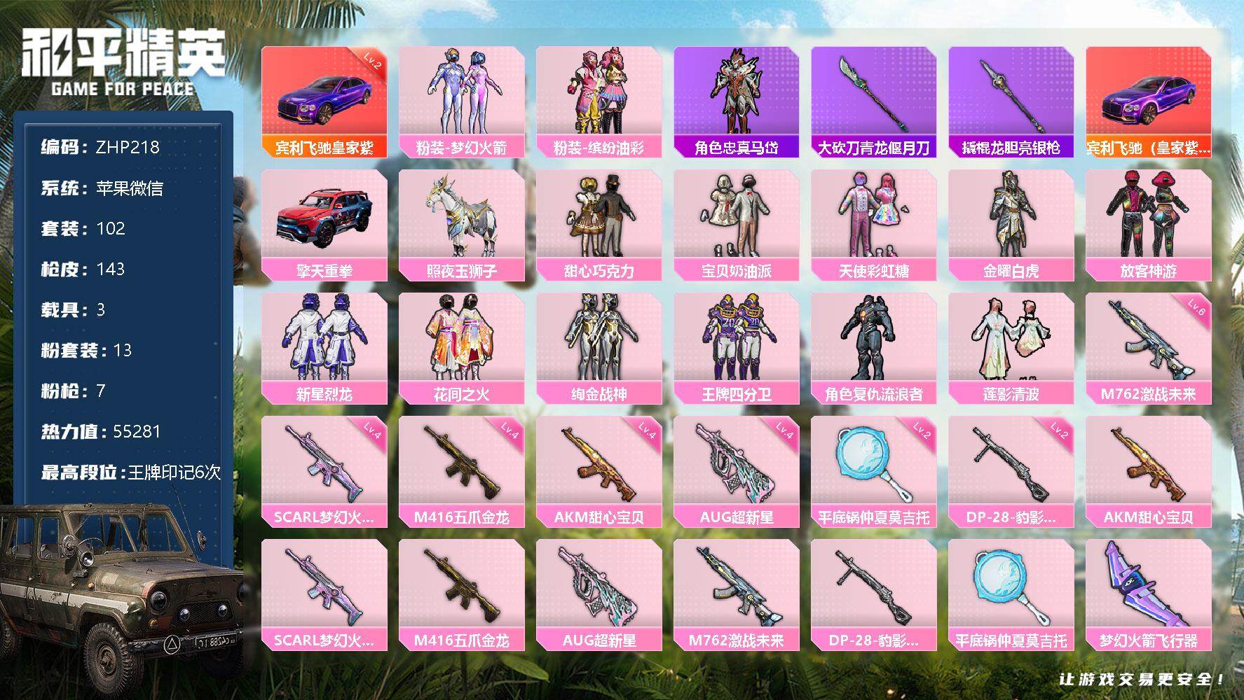[12947687]带王者V8-267皮肤1典藏1珍品22传说/巧克力三姐妹/小白龙/2级宾利/猪妹/放客/苹果 微信-13粉装-7特效枪-3载具-4粉色飞行器-55281热力值-6王牌印记-102套装-143枪皮 【红色载具】:宾利飞驰(皇家紫)(二级) 【热门品类】:粉装-梦幻火箭,粉装-缤纷油彩,角色-忠真马岱,大砍刀-青龙偃月刀,撬棍-龙胆亮银枪 【粉色载具】:宾利飞驰(皇家紫),擎天重拳,照夜玉狮子 【粉色套装】:粉装-甜心巧克力,粉装-宝贝奶油派,粉装-天使彩虹糖,粉装-金曜白虎,粉装-梦幻火箭,粉装-缤纷油彩,粉装-放客神游,粉装-新星烈龙,粉装-花间之火,粉装-绚金战神,粉装-王牌四分卫,角色-复仇流浪者,粉装-莲影清波 【粉色枪皮等级】:AKM-甜心宝贝(四级),SCAR-L-梦幻火箭(四级),M416-五爪金龙(四级),AUG-超新星(四级),M762-激战未来(六级),DP-28-豹影疾电(二级),平底锅-仲夏莫吉托(二级) 【粉色枪皮】:AKM-甜心宝贝,SCAR-L-梦幻火箭,M416-五爪金龙,AUG-超新星,M762-激战未来,DP-28-豹影疾电,平底锅-仲夏莫吉托 【粉色飞行器】:梦幻火箭飞行器,太空嘟嘟飞行器,千面幻镜飞行器 【粉色降落伞】:甜心宝贝降落伞,梦幻火箭降落伞,锦绣火鲤降落伞,童趣迷兔降落伞,王牌四分卫降落伞,垂柳戏鸭降落伞,翩跹演武降落伞,彩虹甜喵降落伞,千面幻镜降落伞,旋转彩虹降落伞,炎氏战神降落伞,超新星降落伞,龙行天下降落伞 【稀有套装】:套装-朱霞炽焰,套装-凌霄紫焰 【稀有枪皮】:AKM-PEL轰鸣竞梦者,AKM-天启纪元,AKM-破晓战魂,AKM-霓虹街区,M16A4-幻世战舞者,SCAR-L-玉兔迎春,SCAR-L-甜蜜誓约,SCAR-L-红色方程式,M416-滑板小狐,M416-糯团青竹,M416-红色方程式,M416-蓝色火焰,GROZA-异彩先驱,GROZA-彩虹符号,GROZA-影袭,GROZA-治愈之星,GROZA-生命誓言,AUG-耀粉歌者,AUG-青春冒险家,QBZ-彩虹符号,QBZ-未来歌姬,QBZ-赛罗,QBZ-银河战甲,M762-天降萌叽,M762-深海曼妙,M762-牛气冲天,M762-甜心宝贝,M762-镭射皇者,Mk47-青春冒险家,G36C-花间之火,AC-VAL-天降萌叽,蜜獾-垂柳戏鸭,蜜