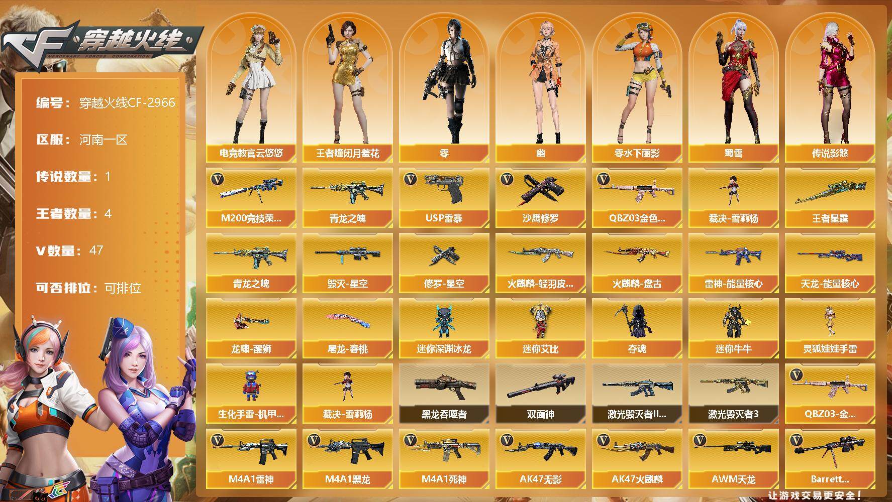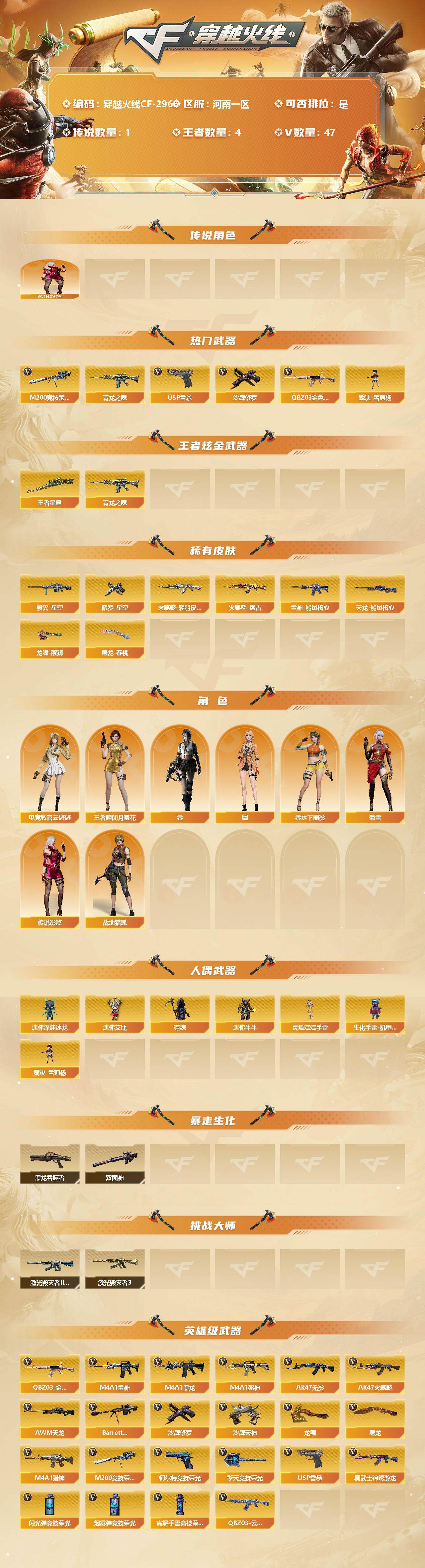 [12946982]河南一区-47V-4王者-0炫金 【传说角色】:传说影煞 【热门武器】:QBZ03-金色蔷薇,M200-竞技荣光,青龙之魄,裁决-雪莉杨,USP-雷暴,沙鹰-修罗 【王者炫金武器】:王者星霆,青龙之魄 【稀有皮肤】:雷神-能量核心,火麒麟-轻羽皮肤,火麒麟-盘古,毁灭-星空,天龙-能量核心,修罗-星空,屠龙-春桃 皮肤,龙啸-醒狮 皮肤 【角色】:传说影煞,王者-瞳-闭月羞花,零-水下丽影,零,幽,电竞教官-云悠悠,战地猎狐,蜀雪 【人偶武器】:裁决-雪莉杨,迷你深渊冰龙,迷你艾比,夺魂,迷你牛牛,灵狐娃娃手雷,生化手雷-机甲核心*4 【暴走生化】:黑龙吞噬者,双面神 【挑战大师】:激光毁灭者III,激光毁灭者III-白马银枪 【英雄级武器】:QBZ03-云龙,M200-竞技荣光,柯尔特-竞技荣光*2,擎天-竞技荣光*2,高爆手雷-竞技荣光*7,烟雾弹-竞技荣光*6,闪光弹-竞技荣光*6,USP-雷暴,QBZ03-金色蔷薇,M4A1-雷神,M4A1-黑龙,M4A1-死神,AK47-无影,AK47-火麒麟,AWM-天龙,Barrett-毁灭,M4A1-猎神,黑武士-锦绣游龙,沙鹰-天神,沙鹰-修罗,龙啸,屠龙*2 【特殊枪械】: