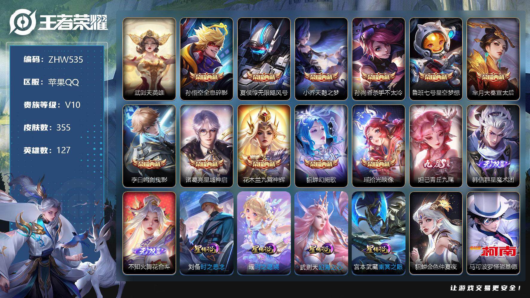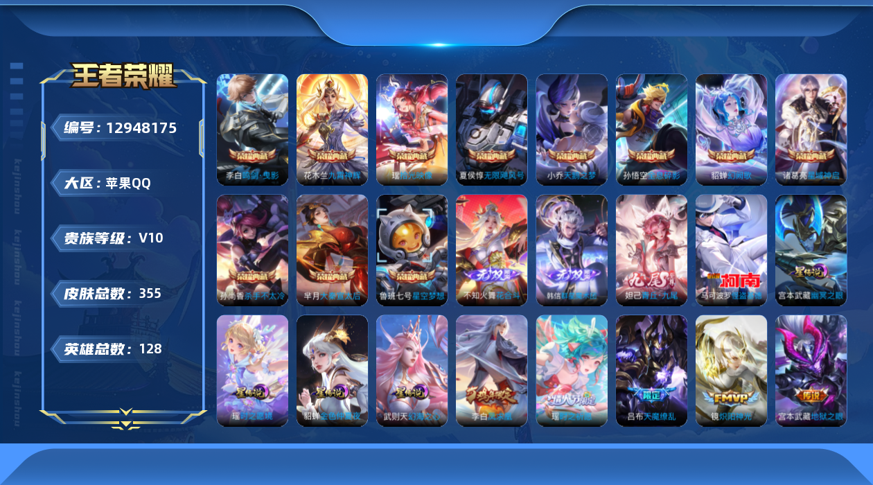 [12948175]苹果Q-V10-至尊星耀II段位-127英雄-355皮肤-11典藏5星传说-3无双-1珍品传说-23传说-93史诗