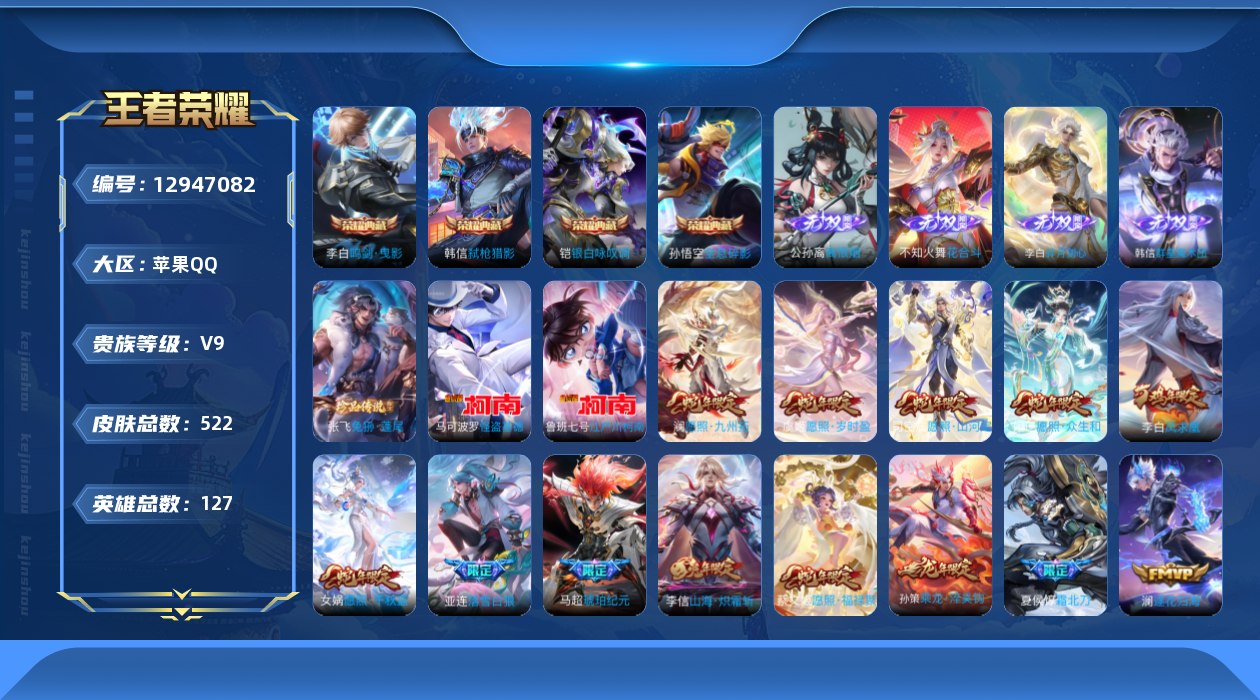 - [11627650]V8 1典藏 2珍品传说 18传说 122英雄 213皮肤 可修改实名 女号 优质装备:九霄神辉(木兰典藏),江户川柯南,怪盗基德,云鹰飞将(小将军),一念神魔,末日机甲-孙尚香(绿蚂蚱),零号·赤焰,时之恋人-刘备(电焊工),淬星耀世,末日机甲-孙策,浮生妄,妄想实况,澜逐花归海,牧神诗旅 传说皮:吕布曦玄引 珍宝阁皮:胡桃夹子 限定皮:愿照·山河定(司空震年限),逐霄战戟,鸣野蒿,夏侯惇霜北刀,至尊宝,傲雪梅枪,无限倾心-项羽,怒海麟威,五谷丰年,天狼运算者,梁祝,逐梦之星,岱宗(典韦年限) 史诗皮:星界战将,炽弈燎原,破空之剑,蒙犽顽岩魄,琥珀纪元伽罗,蔬乡物语(鲁班七号),百相守梦-百里守约,星界特工,紫霞仙子,电玩小子(小书包),白龙吟,黄金分割率,特工魅影,江河有灵,百解令(蒙犽),高渐离燃音魔法,蒙恬荣光圣徽,冰冠公主,青蛇,偶像歌手,电玩·爆裂旋风,末日机甲-吕布,猫狗日记-孙策,修罗,女仆咖啡,水果甜心,绅士熊喵,天才门将,星夜王子,心灵骇客,功夫厨神,德古拉伯爵,暗隐猎兽者,幽灵船长,鬼剑武藏,心灵战警,乐园奇幻夜,地狱岩魂,纤云弄巧,拒霜思,缤纷独角兽,乘风破浪,逐浪之夏,水晶猎龙者,曙光守护者,金属风暴,圣诞狂欢,圣诞恋歌,鹰眼统帅,魅力维加斯,赏金猎手,未来纪元-赵云