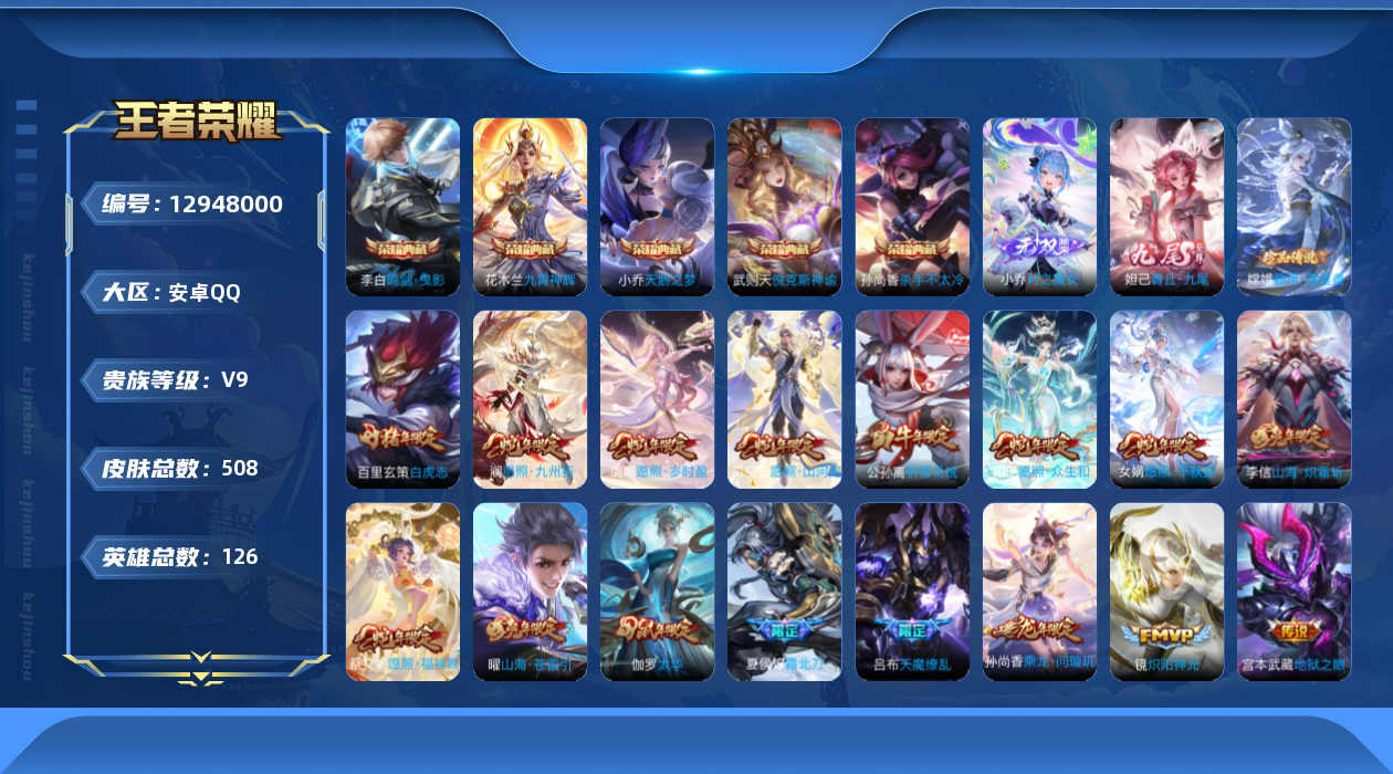 [12948000]对抗路31段/【暑期末清货/特价急出/永久包赔】:安卓Q-V9-至尊星耀IV段位-126英雄-508皮肤-5典藏-2无双-1珍品传说-42传说-164史诗