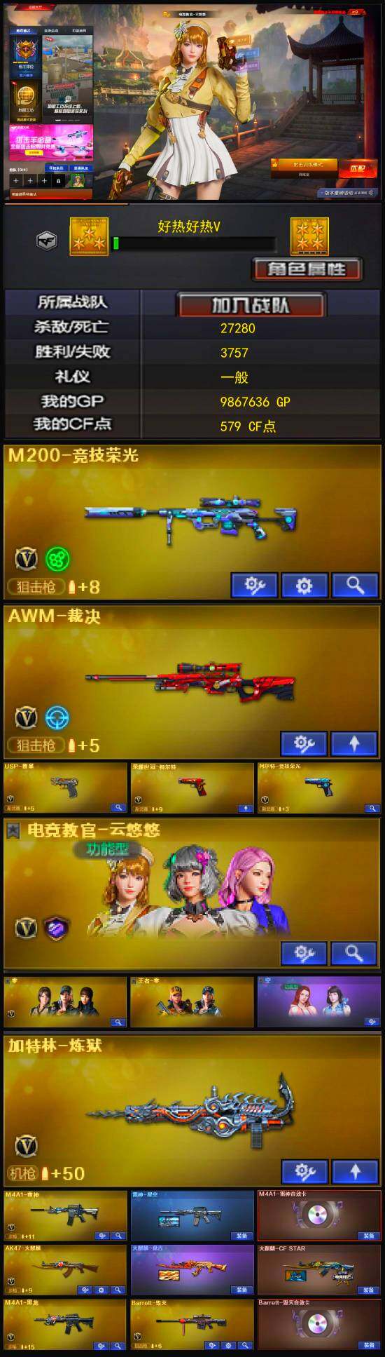 【热门武器】:M200-竞技荣光,荣耀世冠-柯尔特,加特林-炼狱,裁决-雪莉杨,USP-雷暴,沙鹰-修罗*3