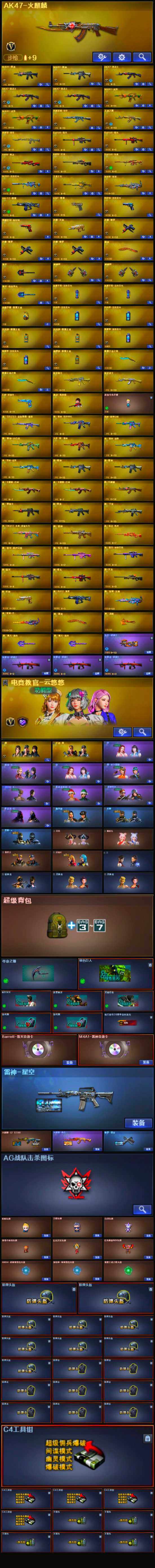 【英雄级武器】:AK47-火麒麟,M4A1-黑龙,M4A1-雷神,AK47-黑武士*3,M4A1-武圣*2,AWM-天龙,Barrett-毁灭,Barrett-极光,AWM-裁决,Barrett-朱雀,M200-竞技荣光,加特林-炼狱,AA-12-雷霆,沙鹰-修罗*3,沙鹰-天神,USP-雷暴,柯尔特-竞技荣光,荣耀世冠-柯尔特,屠龙,擎天,麒麟刺*2,擎天-竞技荣光,高爆手雷-竞技荣光*2,闪光弹-竞技荣光*2,烟雾弹-竞技荣光*2
