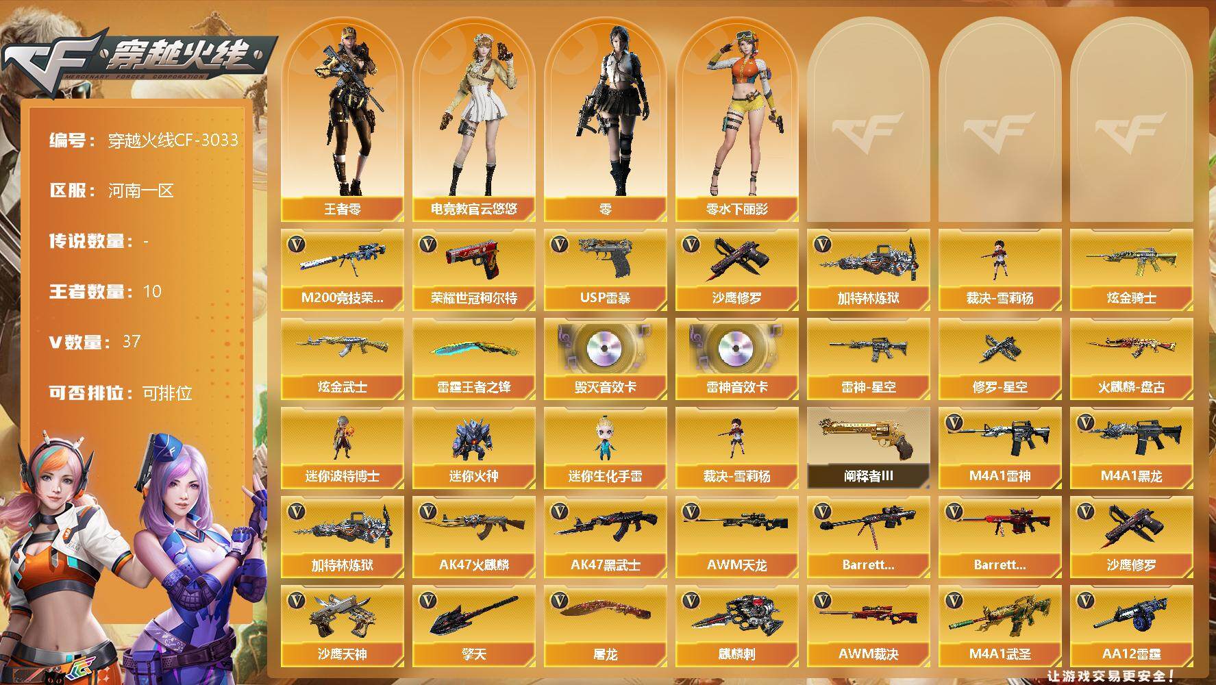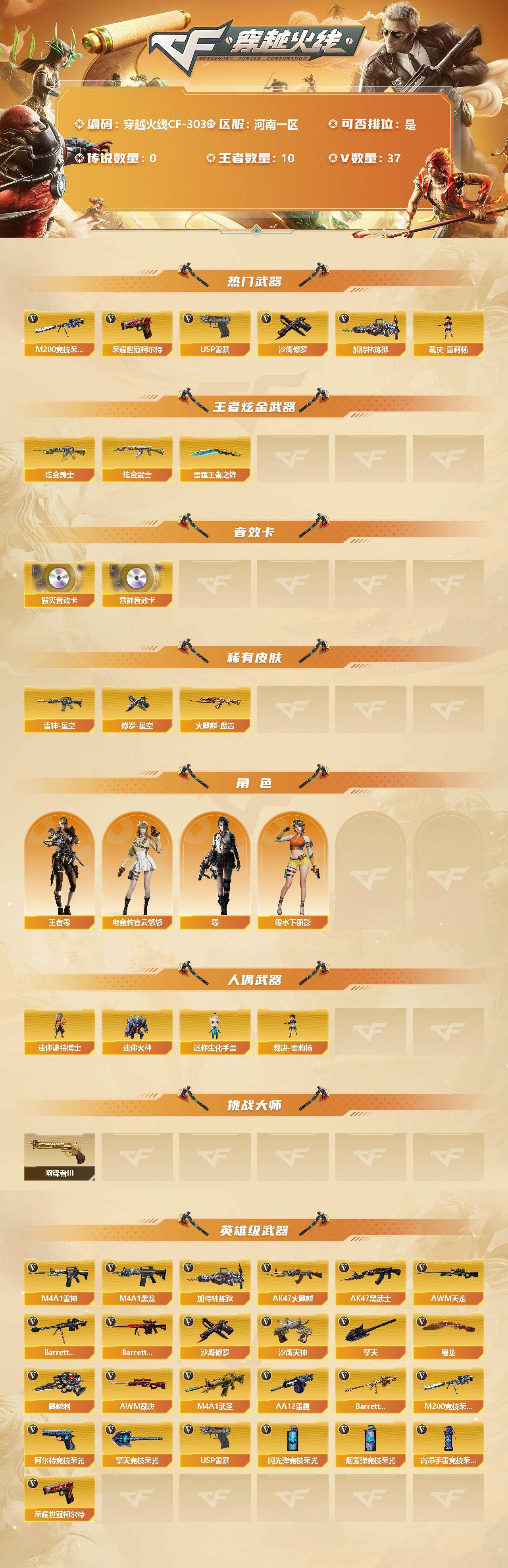 [12947711]河南一区-37V-10王者-2炫金 【热门武器】:M200-竞技荣光,荣耀世冠-柯尔特,加特林-炼狱,裁决-雪莉杨,USP-雷暴,沙鹰-修罗*3 【王者炫金武器】:雷霆王者之锋*2,炫金骑士,炫金武士 【音效卡】:M4A1-雷神音效卡,Barrett-毁灭音效卡 【稀有皮肤】:雷神-星空,火麒麟-盘古,修罗-星空 【角色】:零,电竞教官-云悠悠,王者-零,零-水下丽影 【人偶武器】:裁决-雪莉杨,迷你波特博士,迷你火种,迷你生化手雷 【挑战大师】:阐释者III 【英雄级武器】:AK47-火麒麟,M4A1-黑龙,M4A1-雷神,AK47-黑武士*3,M4A1-武圣*2,AWM-天龙,Barrett-毁灭,Barrett-极光,AWM-裁决,Barrett-朱雀,M200-竞技荣光,加特林-炼狱,AA-12-雷霆,沙鹰-修罗*3,沙鹰-天神,USP-雷暴,柯尔特-竞技荣光,荣耀世冠-柯尔特,屠龙,擎天,麒麟刺*2,擎天-竞技荣光,高爆手雷-竞技荣光*2,闪光弹-竞技荣光*2,烟雾弹-竞技荣光*2 【特殊枪械】:1炼狱
