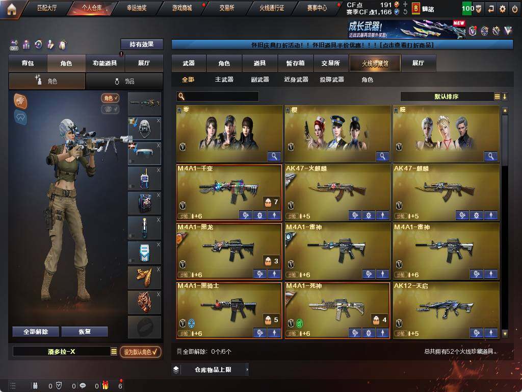 【英雄级武器】:马来剑-夜魔,M4A1-武圣,Glock18-武圣,M4A1-雷神*2,M4A1-黑龙,M4A1-黑骑士,M4A1-死神,汤姆逊-烈龙*3,AK47-麒麟,AK47-火麒麟,AK12-天启,AN94-超新星*2,AWM-天龙,Barrett-毁灭*2,Barrett-极光,AA-12-雷霆,M200-幻神,AK47-黑鲨,M4A1-千变,黑骑士-海王,M4A1-赤狱骑士,沙鹰-天神*2,沙鹰-修罗*2,麒麟刺*2,擎天*4,龙啸,屠龙*2