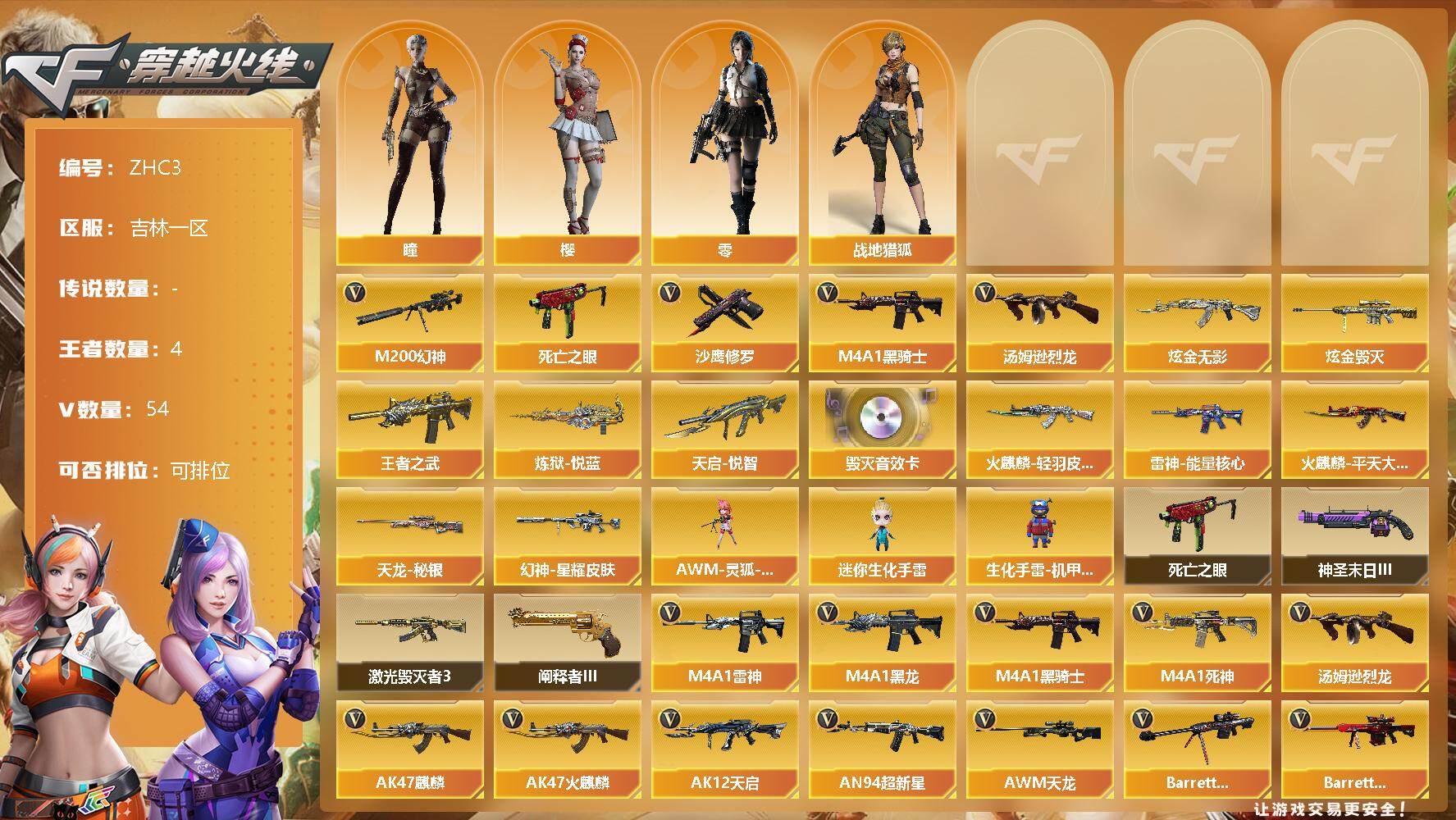 [12948303]吉林一区-54V-4王者-2炫金 【热门武器】:M200-幻神,死亡之眼,M4A1-黑骑士,汤姆逊-烈龙*3,沙鹰-修罗*2 【王者炫金武器】:炫金无影,炫金毁灭,炼狱-悦蓝,天启-悦智,王者之武 【音效卡】:Barrett-毁灭音效卡 【稀有皮肤】:幻神-星耀 皮肤,雷神-能量核心,火麒麟-轻羽皮肤,火麒麟-平天大圣,天龙-秘银 【角色】:零,樱,瞳,战地猎狐 【人偶武器】:AWM-灵狐-15周年嘉年华,迷你生化手雷,生化手雷-机甲核心 【暴走生化】:死亡之眼 【挑战大师】:神圣爆裂者-末日III,阐释者III*2,激光毁灭者III 【英雄级武器】:马来剑-夜魔,M4A1-武圣,Glock18-武圣,M4A1-雷神*2,M4A1-黑龙,M4A1-黑骑士,M4A1-死神,汤姆逊-烈龙*3,AK47-麒麟,AK47-火麒麟,AK12-天启,AN94-超新星*2,AWM-天龙,Barrett-毁灭*2,Barrett-极光,AA-12-雷霆,M200-幻神,AK47-黑鲨,M4A1-千变,黑骑士-海王,M4A1-赤狱骑士,沙鹰-天神*2,沙鹰-修罗*2,麒麟刺*2,擎天*4,龙啸,屠龙*2 【特殊枪械】:1黑骑士,3烈龙