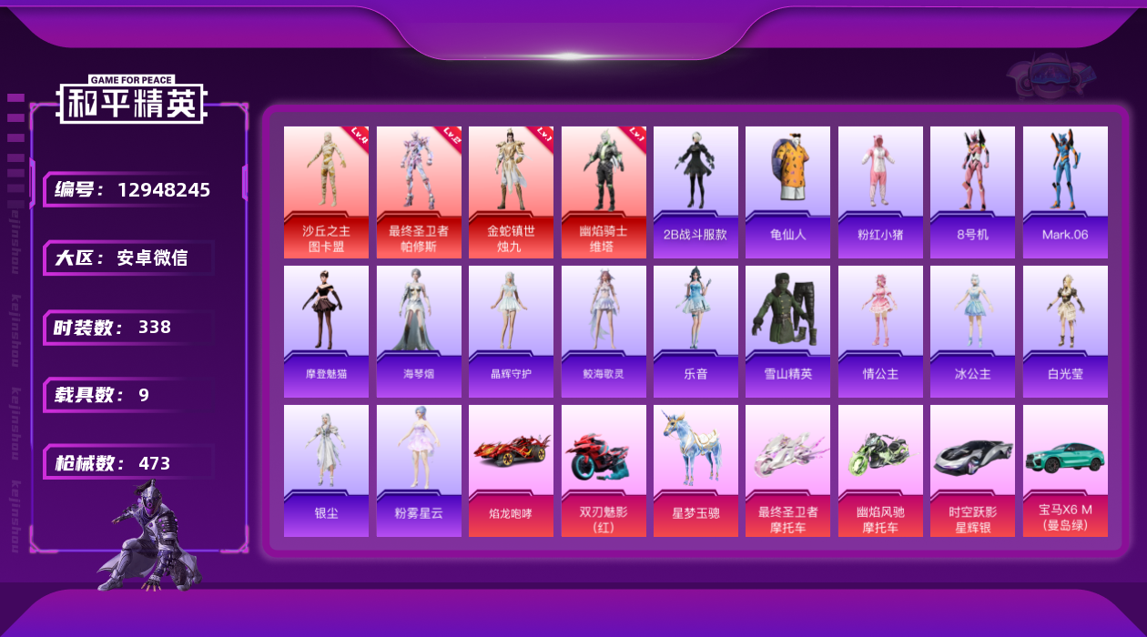[12948245]双字ID讫宁-2绝世-8级M4至情至圣-安卓-4神装-42粉装-43特效枪-9载具-20粉色飞行器-195117热力值-17王牌印记-338套装-473枪皮