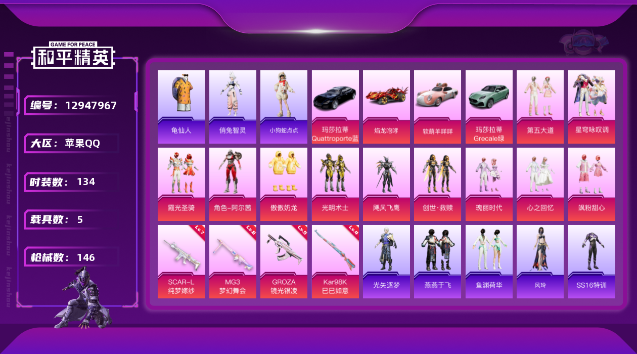 [12947967]素材身法号【特价急出/详情看图】:苹果 手Q-11粉装-4特效枪-5载具-1粉色飞行器-5.6w热力值-10王牌印记-134套装-146枪皮【热门品类】:套装-胖达圆圆,套装-龟仙人【粉色载具】:玛莎拉蒂Quattroporte(夜幕蓝),玛莎拉蒂Grecale(薄荷绿),焰龙咆哮,软萌羊咩咩,僚机-萌兔起飞【粉色套装】:粉装-飓风飞鹰,粉装-光明术士,粉装-霞光圣骑,粉装-第五大道,粉装-心之回忆,粉装-瑰丽时代,粉装-飒粉甜心,角色-阿尔茜,粉装-傲傲奶龙,套装-创世·救赎,粉装-星穹咏叹调【粉色枪皮等级】:SCAR-L-纯梦嫁纱(七级),GROZA-镜光银凌(五级),Kar98K-巳巳如意(四级),MG3-梦幻舞会(六级)【粉色飞行器】:纯梦嫁纱飞行翼