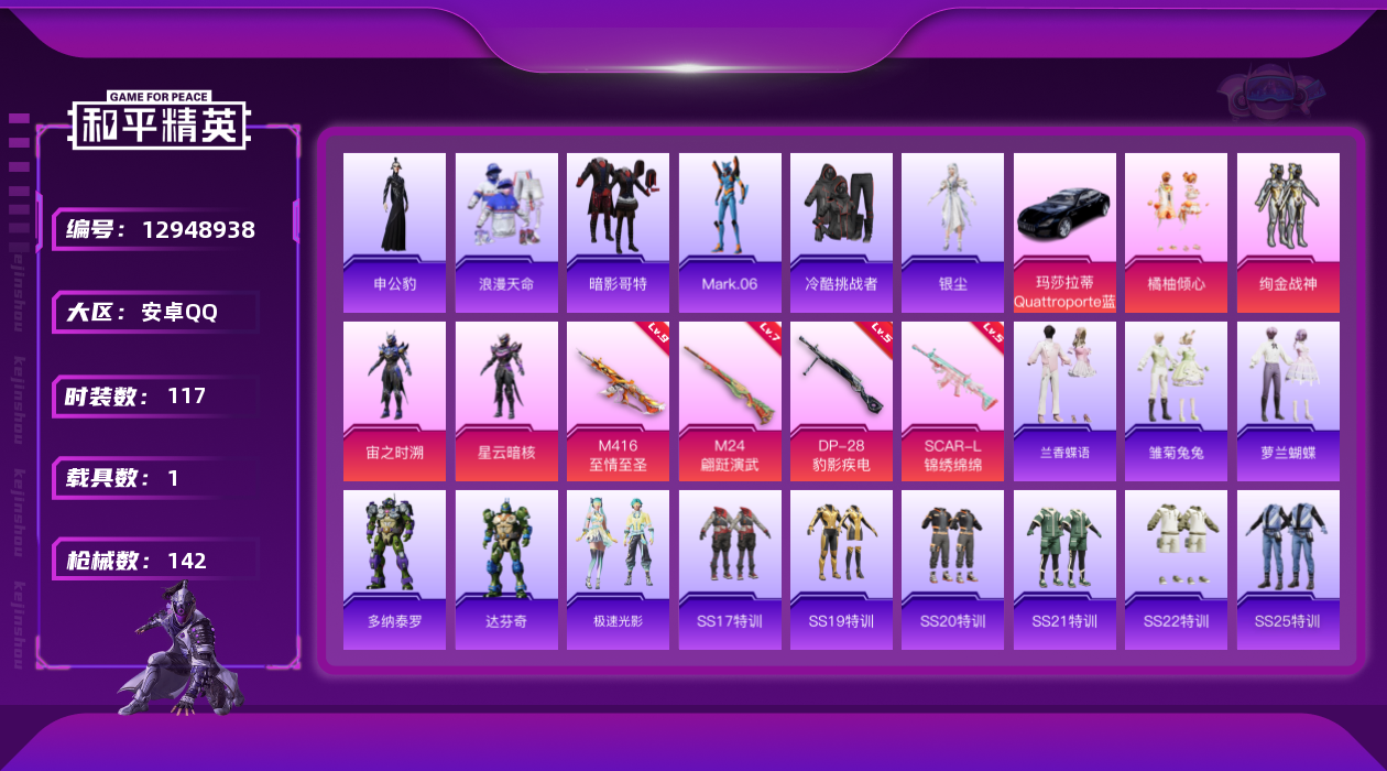 - [11524516]2粉装 4特效枪 10印记 可二次 可修改实名 优质装备:奇异狩猎者,AKM绿萝繁花,SCAR-L-锦绣绵绵,UMP45量子极限,萨利娅,Kar98K-巳巳如意 热门装扮:圣堂之誓,软萌银虎 五级特效枪:五级UMP45-量子极限,五级Kar98K-巳巳如意,五级SCAR-L-锦绣绵绵,五级AKM-绿萝繁花 紫色装扮:田园牧歌,轻风白浪,SS22特训,SS23特训,娇憨猪猪,梦幻奶油,萌趣咩咩,SS21特训,SS31特训套装,人气偶像,冰川特警,冷焰舞者,极速光影,SS30特训套装,SS33特训套装,青涩时光,顶瓜瓜,SS20特训,都市漫游者,都市魅力,长空猛禽,霓虹街区,缤纷果语,耀眼新星,荣耀,荧惑魅影,蓝彩潮人,蓝色运动,街头潮人,魅力单车,麻辣教官,黄色伏地魔,黄色名流,黄色运动,黑色伏地魔,龙的传人,冰河战士,龙魂突击队,蝶变,海岛探路者,涂山之恋,完美偶像,帅气教官,幻世战舞者,战地督导,探宝勇士,湖蓝色名流,绮丽涂鸦,白色伏地魔,破晓战魂,破蛋小黄鸡,空岛之星,竞技达人朋克,王牌教练,灼焰舞者,猛禽,SS29特训,米开朗基罗,星途旅人,白光莹,纯真浪花,热情海星,SS28特训,鱼渊荷华,燕燕于飞,巳巳如意,惊鸿侠骨,神气柴柴,懵萌河马,SS24特训(SS24特训套装),萤火魅影(套装-荧惑魅影),SS25特训,元气发射,锦衣飞扬,焰鹰斗篷,幻羽潜行,SS27特训,明鸳圣池,金羽特工,SS26特训,春光漫游,快闪甜心,大橘大利,智慧之神,SS32特训服(SS32特训套装),绯格组合,糖霜甜心,金耀舞者,蓝调潮人,光之冒险 优质战备:圣堂之誓降落伞,创世·救赎降落伞,精灵梦叶罗丽降落伞,星途旅人降落伞,江南烟雨降落伞,星之彼岸降落伞,幻彩电音降落伞,幻星舰长飞行器,彩虹甜喵降落伞,幻影战神降落伞