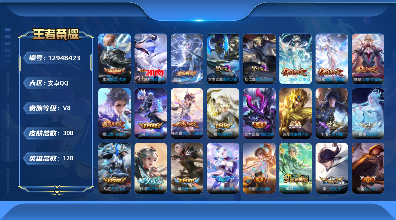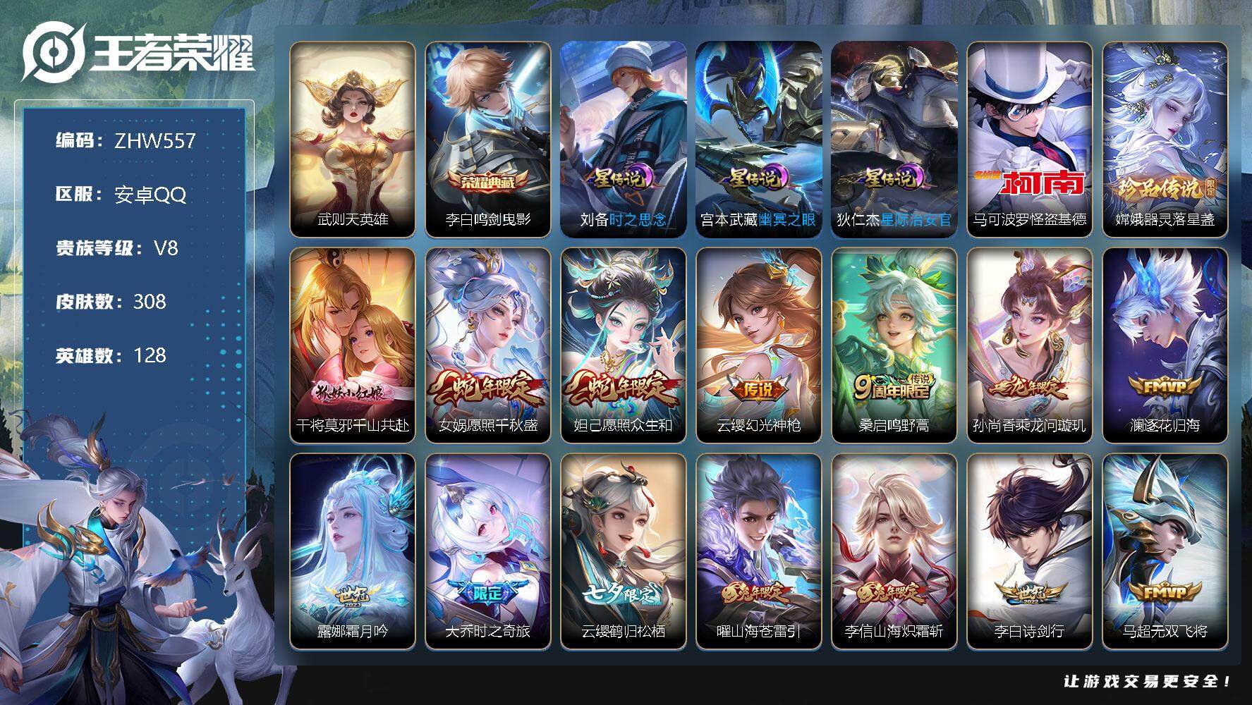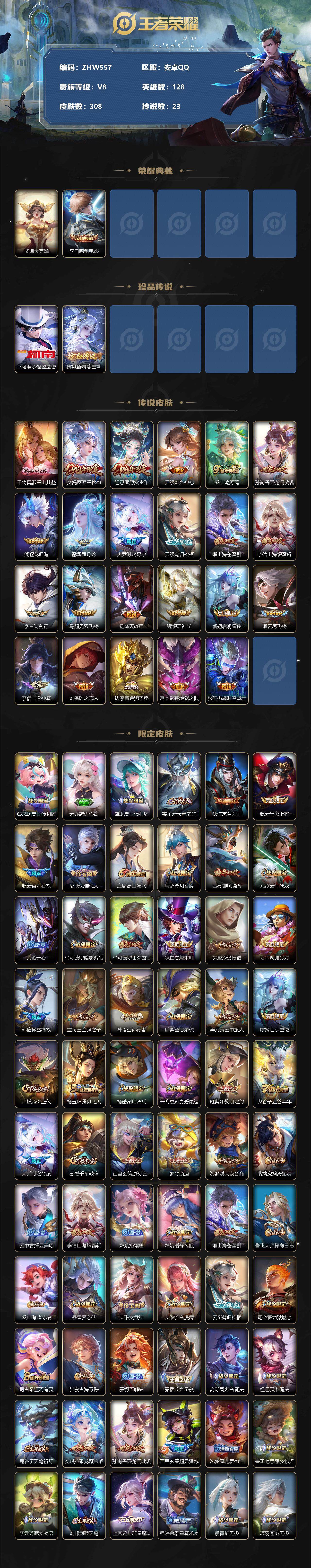 [12948423]【特价急出/详情看图】:安卓Q-V8-最强王者段位-128英雄-308皮肤-1典藏-2珍品传说-23传说-103史诗