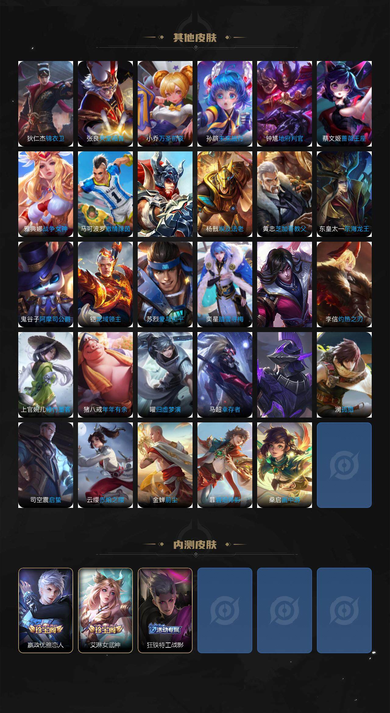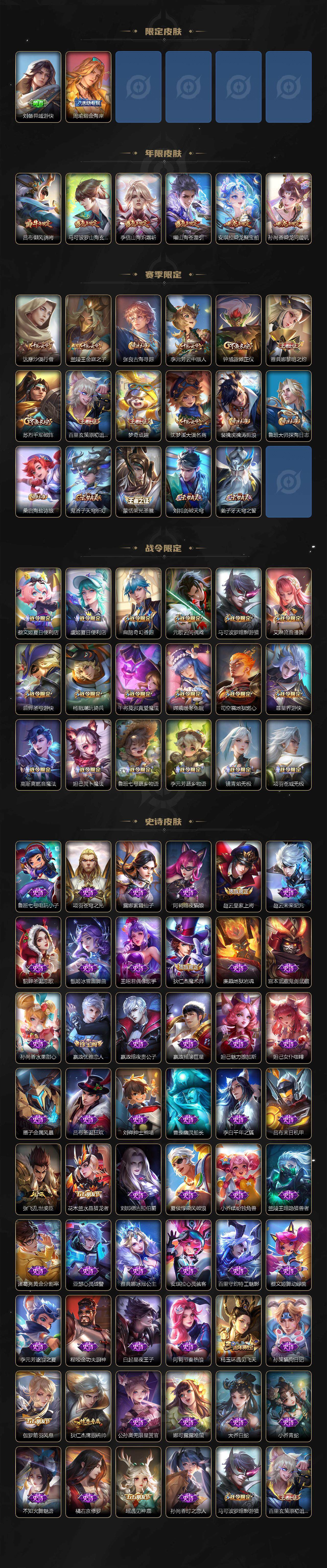 【限定皮肤】:蔡文姬夏日便利店,大乔绒语心约,虞姬夏日便利店,姜子牙天穹之誓,狄仁杰阴阳师,赵云皇家上将,赵云百木心枪,嬴政优雅恋人,庄周高山流水,扁鹊奇幻香踪,吕布御风骁将,元歌云间偶戏,元歌无心,马可波罗暗影游猎,马可波罗山海玄木吟,狄仁杰魔术师,达摩沙漠行僧,项羽海滩派对,韩信傲雪梅枪,兰陵王金庭之子,孙悟空孙行者,后羿圣弓游侠,李元芳云中旅人,虞姬启明星使,钟馗驱傩正仪,杨玉环遇见飞天,杨戬潮玩骑兵,干将莫邪真爱魔法,雅典娜黎明之约,鬼谷子五谷丰年,大乔时之奇旅,苏烈千军破阵,百里玄策原初追逐者,梦奇顽趣,沈梦溪大漠名商,裴擒虎擒涛扼浪,云中君纤云弄巧,李信山海炽霜斩,嫦娥拒霜思,嫦娥暖冬兔眠,曜山海苍雷引,鲁班大师探海日志,桑启海盐诗旅,暃星界游侠,艾琳女武神,艾琳流音漫舞,云缨鹤归松栖,司空震地狱燃心,阿古朵江河有灵,张良古海寻踪,蒙犽百解令,蒙恬荣光圣徽,高渐离燃音魔法,妲己灵卜魔法,鬼谷子天穹祈灯,安琪拉乘龙聚宝船,孙尚香乘龙问璇玑,百里玄策超元猎域,沈梦溪龙舞盛年,鲁班七号蔬乡物语,李元芳蔬乡物语,刘邦剑破天穹,上官婉儿群星魔术团,程咬金群星魔术团,镜青焰无极,项羽苍威无极,刘备异域游侠,周瑜熔金海岸