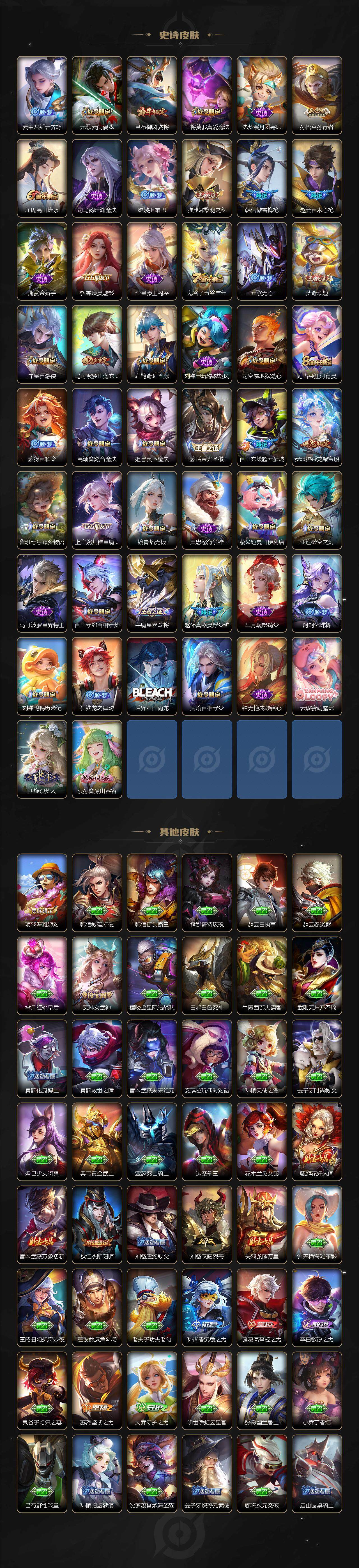 - [12295085]V9 2典藏 27传说 125英雄 363皮肤 典藏英雄武则天 可修改实名 优质装备:天鹅之梦(小乔典藏),大秦宣太后,绛天战甲(鸡嘴战神),黄金白羊座,猫影幻舞,久胜战神,云霓雀翎,地狱火,仲夏夜之梦(大飞蛾),零号·赤焰,海洋之心,飞鸢探春,乞巧织情,游龙清影(小青龙),遇见胡旋,挚爱之约 珍宝阁皮:蔷薇恋人,女武神 限定皮:凤凰于飞,太华(伽罗年限),武陵仙君(小桃花),傲雪梅枪,补天,寅虎·展翼(孙膑年限),时之彼端,白鹤梁神女,魔法小厨娘,白晶晶,时雨天司(水龙头),玄嵩(庄周年限),至美·乘鲤谣,至美·化雀舞,遇见飞天,高山流水,匿光决锋者,五谷丰年,幽恒(沐浴露),天狼运算者,游园惊梦,梁祝,御风骁将(吕布年限),天狼溯光者,逐梦之音,奔雷神使(牛魔年限),祈雪灵祝(雪兔子),天狼绘梦者,李小龙,逐梦之光,如梦令-后羿,霸王别姬-项羽,霸王别姬-虞姬,奇迹圣诞,默契交锋-兰陵王,默契交锋-花木兰,孙行者,猪悟能,天魔缭乱,冰霜恋舞曲,乒乒小将,热情桑巴,女儿国国王,寅虎·御盾(廉颇年限),寅虎·瑞焰(虎皮蛋子),寅虎·心曲(虎婆),寅虎·赤拳(老虎年限),时之祈愿-瑶(瑶传限),无尽星芒 史诗皮:化蝶舞,龙之律动,百相守梦-周瑜,守夜人,紫霞仙子,苍穹之光,电玩小子(小书包),特工魅影,江河有灵,百解令(蒙犽),蒙恬荣光圣徽,偶像歌手,龙骑士(小龙虾),暗夜猫娘,魅语,冰冠公主,青蛇,时之恋人-孙尚香,乱世虎臣,节奏热浪,女仆咖啡,摇滚巨星,水果甜心,绅士熊喵,天才门将,星夜王子,心灵骇客,时之奇旅-安琪拉,功夫厨神,德古拉伯爵,暗隐猎兽者,幽灵船长,鬼剑武藏,心灵战警,舞动绿茵,地狱岩魂,诗语江南,纤云弄巧,繁星吟游(呼啦呼啦),拒霜思,缤纷独角兽,乘风破浪,逐浪之夏,水晶猎龙者,曙光守护者,箭羽风息,唤灵魅影,金属风暴,原初追逐者,圣诞狂欢,圣诞恋歌,鹰眼统帅,魅力维加斯,黎明之约,奇遇舞章,天秀·音浪,寅虎·御盾,千筹问战,无心,未来纪元-赵云