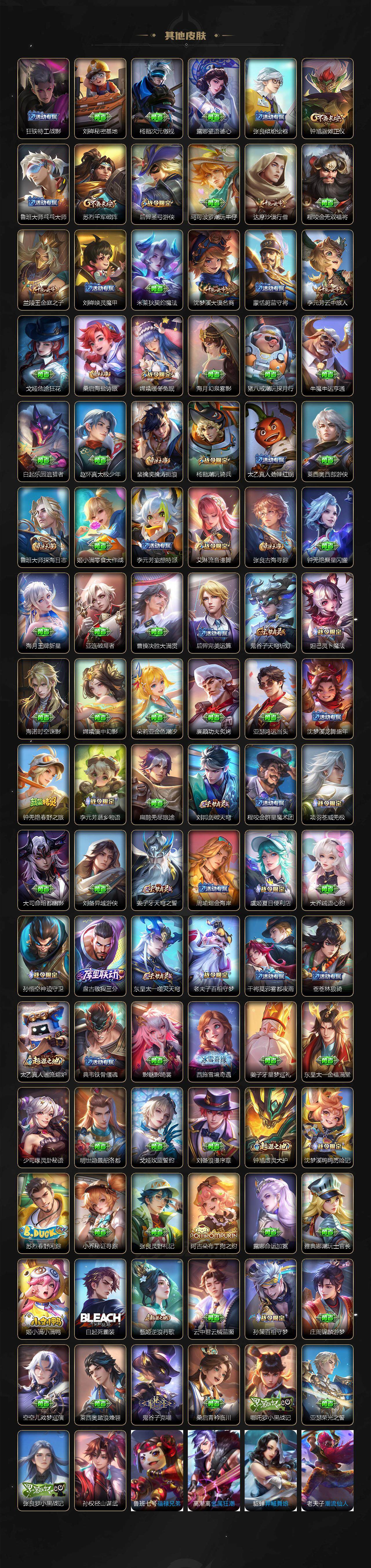 小乔青蛇,大乔白蛇,瑶遇见神鹿,娜可露露晚萤,伽罗箭羽风息,李元芳逐浪之夏,不知火舞魅语,公孙离无限星赏官,孙策猫狗日记,阿轲节奏热浪,露娜紫霞仙子,诸葛亮黄金分割率,王昭君偶像歌手,项羽苍穹之光,孙尚香时之恋人,阿轲暗夜猫娘,雅典娜冰冠公主,吕布末日机甲,鲁班七号电玩小子,橘右京修罗,嬴政摇滚巨星,刘禅绅士熊喵,白起星夜王子,安琪拉心灵骇客,程咬金功夫厨神,刘邦德古拉伯爵,兰陵王暗隐猎兽者,曹操幽灵船长,宫本武藏鬼剑武藏,司马懿暗渊魔法,亚瑟心灵战警,蔡文姬舞动绿茵,廉颇地狱岩魂,小乔缤纷独角兽,夏侯惇乘风破浪,花木兰水晶猎龙者,墨子金属风暴,百里玄策原初追逐者,吕布圣诞狂欢,貂蝉圣诞恋歌,百里守约特工魅影,嬴政暗夜贵公子,嫦娥拒霜思,雅典娜黎明之约,李白千年之狐,澜赏金猎手,貂蝉唤灵魅影,弈星滕王阁序,刘禅电玩·爆裂旋风,蒙犽百解令,高渐离燃音魔法,安琪拉乘龙·聚宝船,上官婉儿群星魔术团,赵怀真器灵·浮梦炉