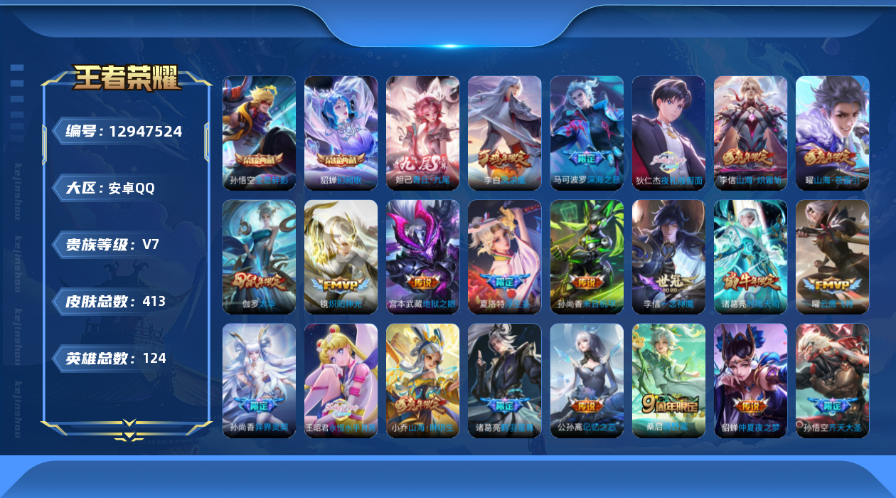 [12947524]【暑期末清货/特价急出/永久包赔】:安卓Q-V7-永恒钻石I段位-124英雄-413皮肤-2典藏-1无双-43传说-121史诗