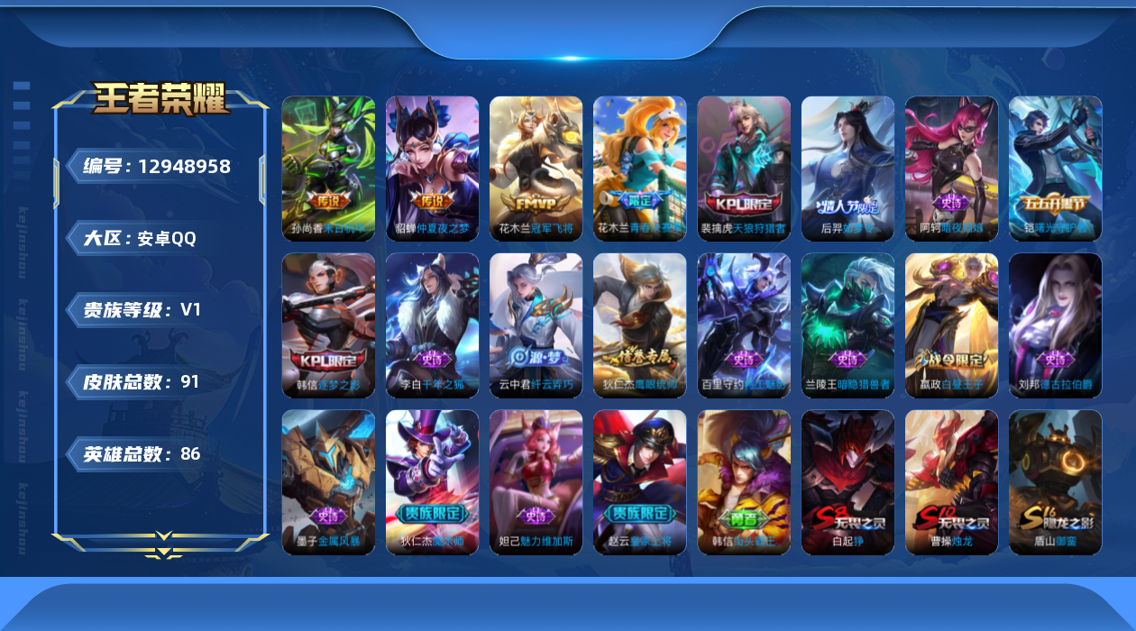 - [12594380]安卓Q-V9-最强王者段位-124英雄-263皮肤-3典藏-0珍品无双-1无双-2珍品传说-26传说-82史诗 【荣耀典藏】:孙尚香杀手不太冷,花木兰九霄神辉,韩信弑枪猎影 【无双皮肤】:李白碎月剑心 【珍品传说】:张飞兔狲蓬尾,宫本武藏黑崎一护 【传说皮肤】:澜愿照九州拓,云缨幻光神枪,桑启鸣野蒿,典韦战鼓燎原,孙策乘龙淬吴钩,马超琥珀纪元,澜逐花归海,王昭君永恒水手月亮,兰陵王影龙天霄,宫本武藏惊梅引,花木兰燃星之曲,马可波罗深海之息,女娲补天,孙策末日机甲,赵云淬星耀世,铠绛天战甲,镜炽阳神光,虞姬启明星使,关羽武圣,曜云鹰飞将,李信一念神魔,刘备时之恋人,达摩黄金狮子座,杨戬永曜之星,孙尚香末日机甲,宫本武藏地狱之眼 【限定皮肤】:姜子牙天穹之誓,狄仁杰阴阳师,赵云皇家上将,扁鹊奇幻香踪,吕布御风骁将,典韦岱宗,马可波罗深海之息,狄仁杰魔术师,项羽海滩派对,关羽武圣,关羽百相守梦,兰陵王影龙天霄,花木兰默契交锋,花木兰燃星之曲,牛魔奔雷神使,虞姬启明星使,杨戬永曜之星,杨戬潮玩骑兵,女娲补天,哪吒逐梦之翼,雅典娜单词大作战,雅典娜黎明之约,苏烈玄武志,沈梦溪匿光破解者,裴擒虎擒涛扼浪,云中君纤云弄巧,云中君时之祈愿,嫦娥暖冬兔眠,西施玲珑珍味,西施至美乘鲤谣,蒙犽狂想玩偶喵,鲁班大师探海日志,桑启海盐诗旅,暃星界游侠,戈娅驭风魔法,艾琳流音漫舞,司空震地狱燃心,阿古朵江河有灵,张良古海寻踪,王昭君永恒水手月亮,蒙犽百解令,高渐离燃音魔法,妲己灵卜魔法,鬼谷子天穹祈灯,李白碎月剑心,伽罗琥珀纪元,马超琥珀纪元,姬小满妄想食味,孙策乘龙淬吴钩,鲁班七号蔬乡物语,李元芳蔬乡物语,刘邦剑破天穹,程咬金群星魔术团 【年限皮肤】:苏烈玄武志,杨戬永曜之星,吕布御风骁将,牛魔奔雷神使,典韦岱宗,关羽武圣,孙策乘龙淬吴钩 【赛季限定】:张良古海寻踪,雅典娜黎明之约,裴擒虎擒涛扼浪,鲁班大师探海日志,桑启海盐诗旅,鬼谷子天穹祈灯,刘邦剑破天穹,姜子牙天穹之誓 【战令限定】:扁鹊奇幻香踪,艾琳流音漫舞,杨戬潮玩骑兵,雅典娜单词大作战,嫦娥暖冬兔眠,西施玲珑珍味,蒙犽狂想玩偶喵,司空震地狱燃心,暃星界游侠,戈娅驭风魔法,高渐离燃音魔法,妲己灵卜魔法,鲁班七号蔬乡物语,李元芳蔬乡物语 【史诗皮肤】:鲁班七号电玩小子,项羽苍穹之光,阿轲暗夜猫娘,赵云皇家上将,赵云未来纪元,貂蝉圣诞