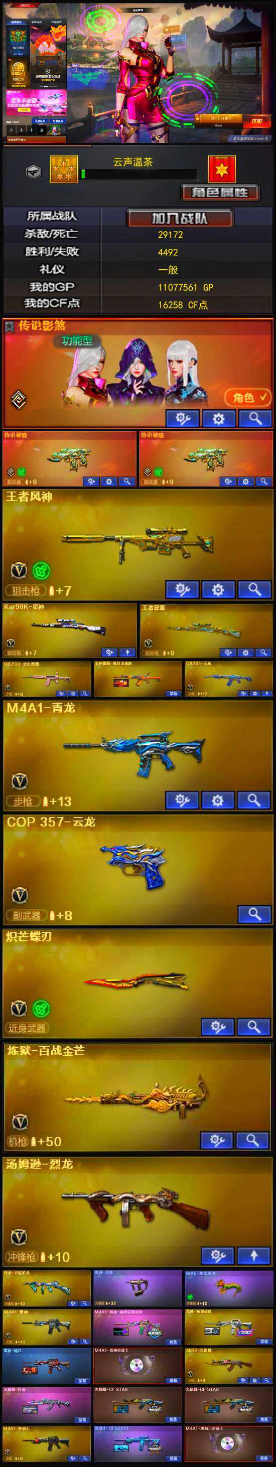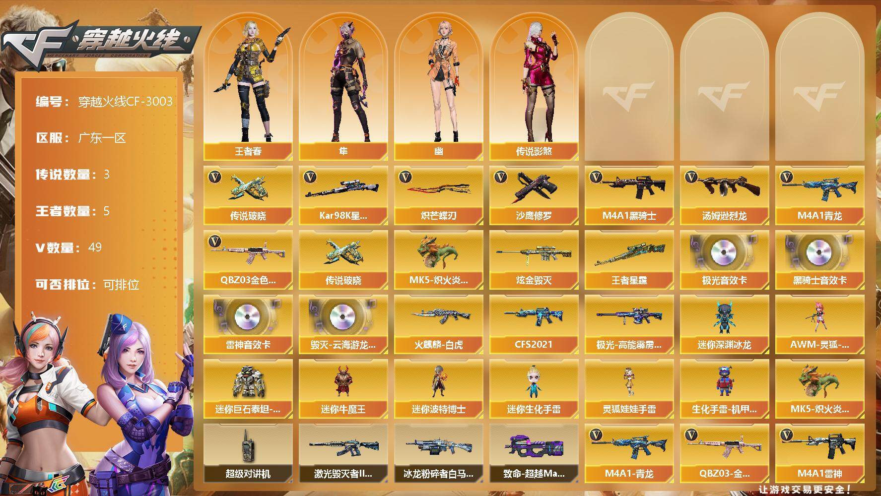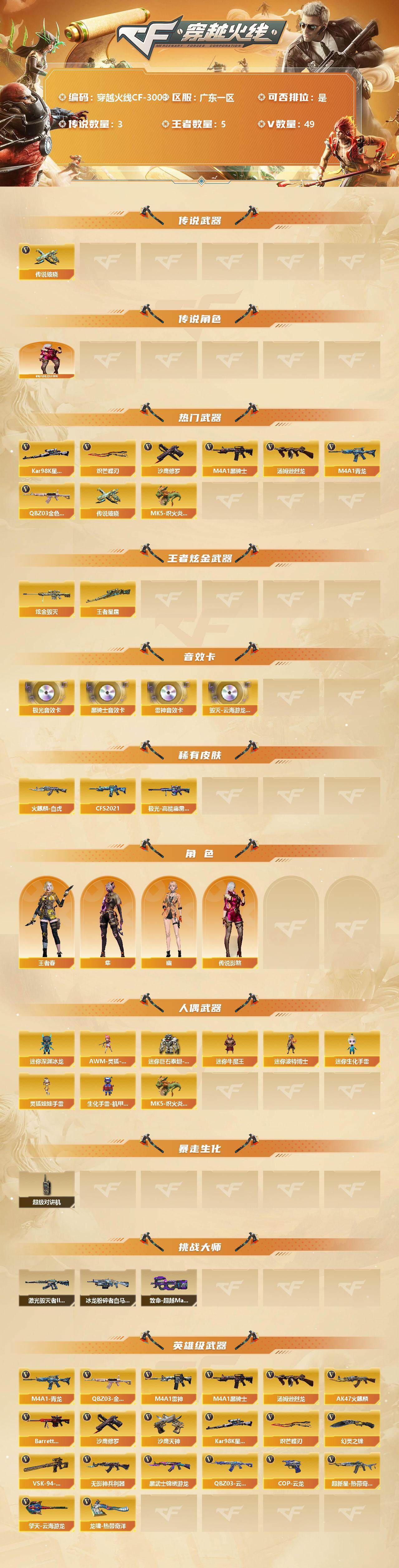 [12947262]广东一区-49V-5王者-1炫金 【传说武器】:传说破晓*2 【传说角色】:传说影煞 【热门武器】:传说破晓*2,QBZ03-金色蔷薇,M4A1-青龙,Kar98K-星神,M4A1-黑骑士,汤姆逊-烈龙,MK5-炽火炎龙,沙鹰-修罗*2,炽芒蝶刃 【王者炫金武器】:炫金毁灭,王者星霆 【音效卡】:M4A1-雷神音效卡,M4A1-黑骑士音效卡,Barrett-毁灭-云海游龙音效卡,Barrett-极光音效卡 【稀有皮肤】:火麒麟-白虎,黑骑士-CFS2021,极光-高能霹雳 皮肤 【角色】:传说影煞,王者春,幽,隼 【人偶武器】:MK5-炽火炎龙,AWM-灵狐-15周年嘉年华,迷你深渊冰龙,迷你巨石泰坦-魔花研究所,迷你牛魔王,迷你波特博士,迷你生化手雷*3,灵狐娃娃手雷,生化手雷-机甲核心 【暴走生化】:超级对讲机 【挑战大师】:激光毁灭者III-白马银枪*2,冰龙粉碎者-白马银枪,致命乱世-超越Max 【英雄级武器】:QBZ03-云龙,COP 357-云龙,幻灵之锋,QBZ03-金色蔷薇,M4A1-青龙,无影-神兵利器,M4A1-雷神,M4A1-黑骑士,汤姆逊-烈龙,AK47-火麒麟,Barrett-极光,Kar98K-星神,VSK-94-金蚀,黑武士-锦绣游龙,超新星-热带奇洋,沙鹰-天神*2,沙鹰-修罗*2,炽芒蝶刃,擎天-云海游龙,龙啸-热带奇洋 【特殊枪械】:1黑骑士,1烈龙
