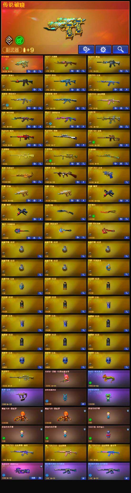 【热门武器】:传说破晓*2,QBZ03-金色蔷薇,M4A1-青龙,Kar98K-星神,M4A1-黑骑士,汤姆逊-烈龙,MK5-炽火炎龙,沙鹰-修罗*2,炽芒蝶刃