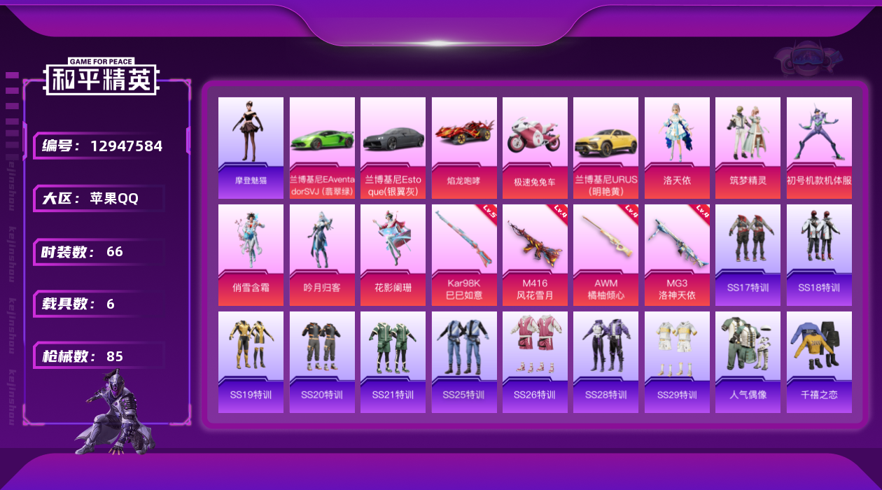 - PX_2094928- 苹果手Q-11王牌印记-5粉装-6特效枪-1载具-63487热力值-134套装-193枪皮-0卓越印记-0传奇印记 【5粉装】,洛天依,绯穹魔姬,碧影闪光,莲影清波,音爆索尼克 【6特效枪】AKM-星际浪客-6级 M416-五爪金龙-7级 GROZA-镜光银凌-5级 Kar98K-巳巳如意-5级 SLR-暗夜玫瑰-5级 UMP45-恐龙拽拽-7级 【7稀有紫装】,派对舞王