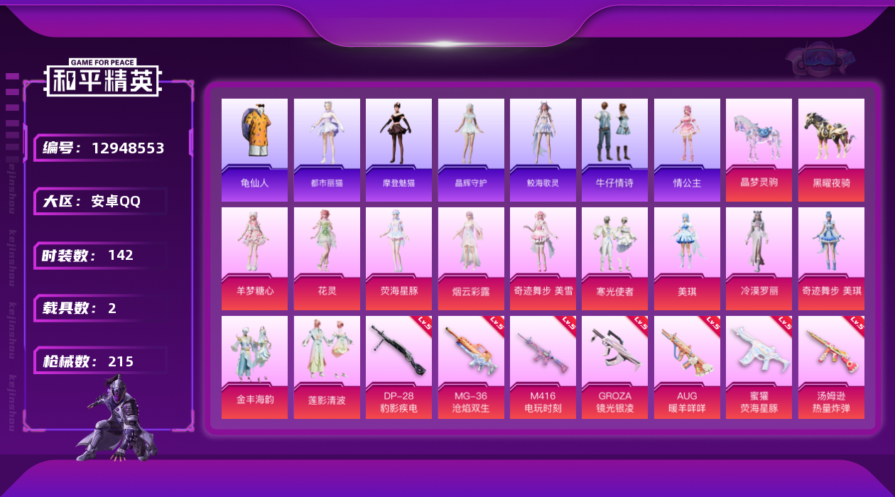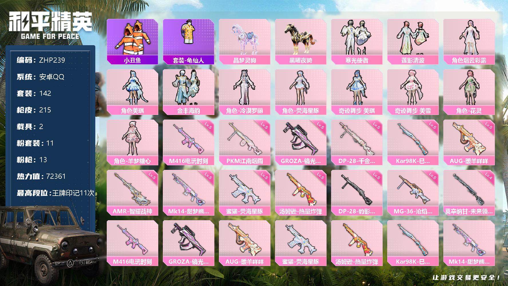 [12948553]【特价!急出!】安卓 手Q-11粉装-13特效枪-2载具-4粉色飞行器-72361热力值-11王牌印记-142套装-215枪皮