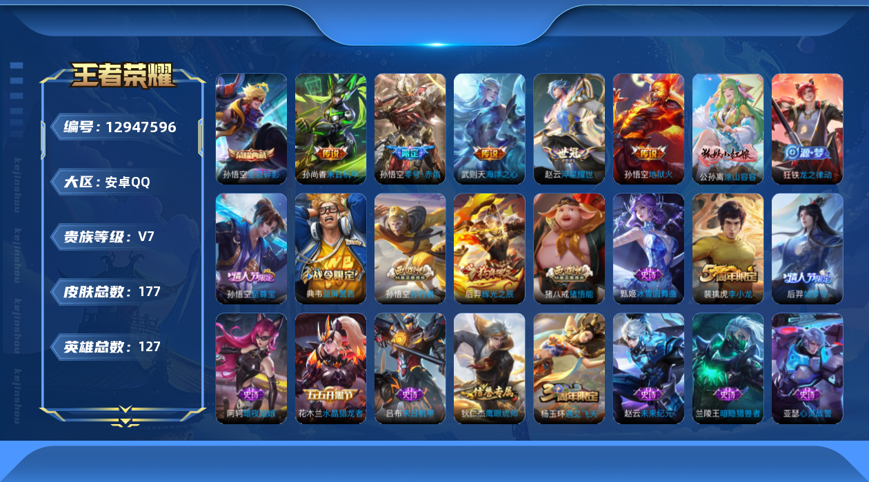 [12947596]安卓Q-V7-永恒钻石II段位-126英雄-177皮肤-1典藏-5传说-37史诗 【荣耀典藏】:武则天英雄,孙悟空全息碎影 【传说皮肤】:赵云淬星耀世,孙悟空零号赤焰,孙尚香末日机甲,孙悟空地狱火,武则天海洋之心 【限定皮肤】:白起狰,狄仁杰阴阳师,虞姬凯尔特女王,赵云皇家上将,鲁班七号狮舞东方,庄周蜃楼王,庄周高山流水,高渐离死亡摇滚,高渐离玩趣恶龙,孙膑妖精王,扁鹊炼金王,芈月重明,芈月幻夜卜梦,吕布猎兽之王,夏侯惇朔风刀,曹操烛龙,典韦穷奇,典韦蓝屏警告,狄仁杰魔术师,狄仁杰万华元夜,达摩沙漠行僧,项羽海滩派对,老夫子醍醐杖,程咬金演武夺筹,兰陵王金庭之子,孙悟空美猴王,孙悟空至尊宝,孙悟空零号赤焰,孙悟空孙行者,牛魔御旌,后羿辉光之辰,后羿如梦令,后羿圣弓游侠,李元芳银河之约,李元芳云中旅人,钟馗神迹守卫,钟馗驱傩正仪,杨玉环遇见飞天,女娲朔望之晖,干将莫邪真爱魔法,雅典娜单词大作战,太乙真人饕餮,鬼谷子原初探秘者,黄忠火炮绅士,苏烈千军破阵,弈星混沌棋,沈梦溪星空之诺,明世隐疑决卦,裴擒虎李小龙,狂铁御狮,米莱狄御霄,盾山御銮,猪八戒猪悟能,蒙犽狂想玩偶喵 【年限皮肤】:孙悟空美猴王,后羿辉光之辰 【赛季限定】:庄周蜃楼王,孙膑妖精王,扁鹊炼金王,白起狰,芈月重明,夏侯惇朔风刀,曹操烛龙,典韦穷奇,狄仁杰万华元夜,达摩沙漠行僧,老夫子醍醐杖,程咬金演武夺筹,兰陵王金庭之子,牛魔御旌,李元芳云中旅人,虞姬凯尔特女王,钟馗驱傩正仪,太乙真人饕餮,鬼谷子原初探秘者,苏烈千军破阵,弈星混沌棋,明世隐疑决卦,狂铁御狮,米莱狄御霄,盾山御銮 【战令限定】:鲁班七号狮舞东方,芈月幻夜卜梦,吕布猎兽之王,典韦蓝屏警告,后羿圣弓游侠,李元芳银河之约,钟馗神迹守卫,女娲朔望之晖,干将莫邪真爱魔法,雅典娜单词大作战,黄忠火炮绅士,沈梦溪星空之诺,蒙犽狂想玩偶喵 【史诗皮肤】:阿轲暗夜猫娘,赵云皇家上将,赵云未来纪元,甄姬冰雪圆舞曲,王昭君偶像歌手,狄仁杰魔术师,宫本武藏鬼剑武藏,妲己魅力维加斯,墨子金属风暴,吕布圣诞狂欢,吕布末日机甲,孙悟空至尊宝,花木兰水晶猎龙者,小乔缤纷独角兽,兰陵王暗隐猎兽者,亚瑟心灵战警,雅典娜冰冠公主,后羿辉光之辰,蔡文姬舞动绿茵,刘禅天才门将,李元芳逐浪之夏,杨玉环遇见飞天,典韦蓝屏警告,鲁班七号狮舞东方,狄仁杰鹰眼统帅,李元芳银河之约,后羿如梦