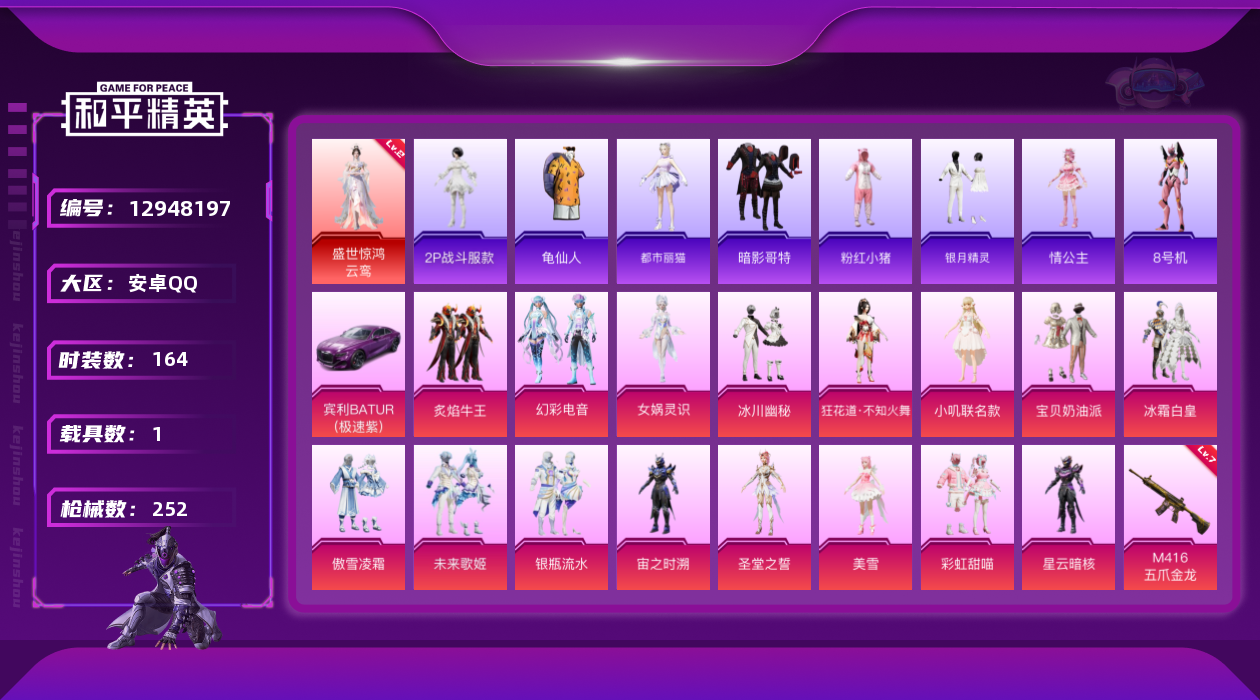 [12948197]【特价急出/详情看图】:安卓 手Q-1红装-17粉装-8特效枪-1载具-9w热力值-5印记-164套装-252枪皮【热门品类】:角色-2P战斗服款,角色-忠猛周仓,角色-忠真马岱,角色-忠义严颜,大砍刀-青龙偃月刀,撬棍-龙胆亮银枪【角色神装等级】:盛世惊鸿-云鸾(二级)【稀有载具】:宾利BATUR(极速紫)【特效枪等级】:AKM-绿萝繁花(五级),SCAR-L-锦绣绵绵(五级),M416-五爪金龙(七级),M416-电玩时刻(五级),Kar98K-巳巳如意(五级),Mk14-盛世惊鸿(三级),DP-28-豹影疾电(五级),MG3-洛神天依(七级)【优质套装】:粉装-宝贝奶油派,粉装-梦幻火箭,粉装-冰霜白皇,粉装-炙焰牛王,粉装-傲雪凌霜,粉装-彩虹甜喵,粉装-冰川幽秘,粉装-未来歌姬,粉装-银瓶流水,角色-宙之时溯,角色-星云暗核,角色-圣堂之誓,角色-小叽联名款,角色-美雪,角色-狂花道·不知火舞,角色-女娲灵识,粉装-幻彩电音【优质飞行器】:酣梦熊熊飞行器,甜蜜誓约飞行器,千面幻镜飞行器,粉樱探戈飞行器,镜域双华-灵镜之阶,深渊漩涡飞行器,凤舞九天飞行器