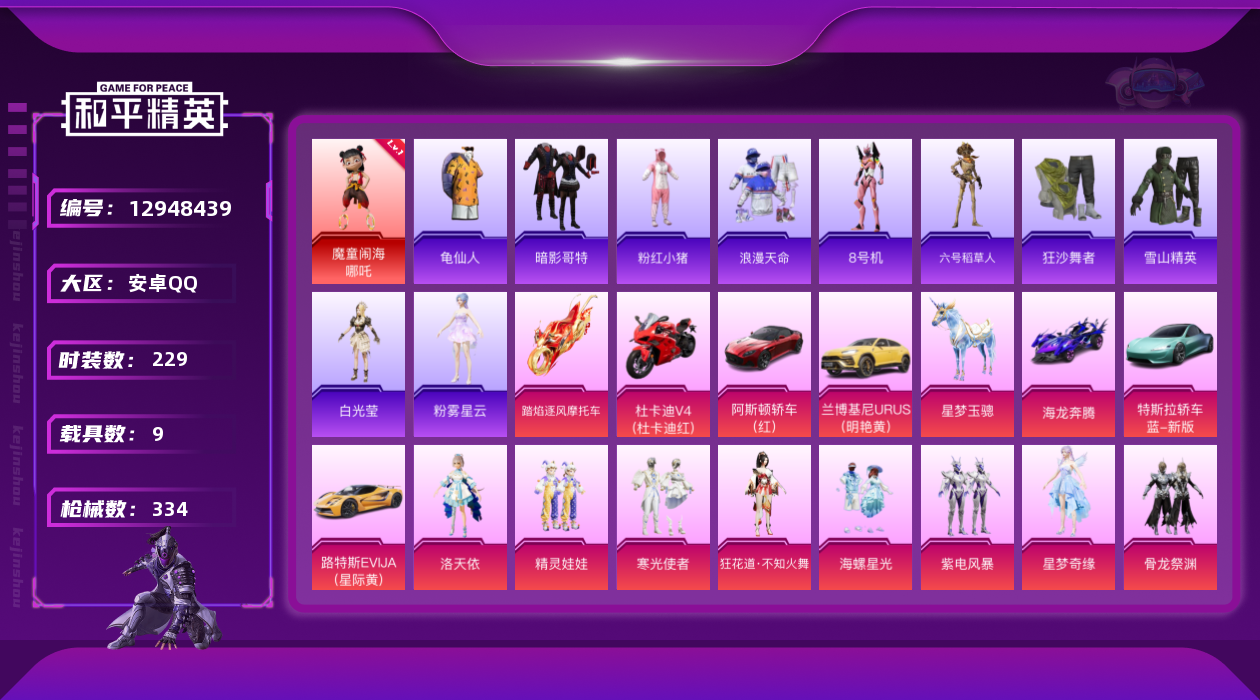 [12948439]璀璨碎片487/M416-至情至圣(九级)【特价急出/详情看图】:安卓 手Q-1红装-25粉装-15特效枪-9载具-12粉色飞行器-13.2w热力值-13王牌印记-229套装-334枪皮【红色神装等级】:魔童闹海-哪吒(一级)【热门品类】:套装-深海小丑鱼,套装-AG战队服,粉装-繁龙极客,套装-龟仙人,套装-暗影哥特,粉装-梦幻火箭,粉装-缤纷油彩,套装-浪漫波比,套装-粉红小猪,套装-浪漫天命,角色-8号机,角色-六号稻草人【粉色载具】:特斯拉Roadster(水滴蓝),兰博基尼URUS(明艳黄),阿斯顿马丁DBS(红),路特斯EVIJA(星际黄),海龙奔腾,杜卡迪 Panigale V4(杜卡迪红),踏焰逐风摩托车,僚机-萌兔起飞,星梦玉骢【粉色套装】:粉装-深渊皇后,粉装-宝贝奶油派,粉装-梦幻火箭,粉装-星之信仰,粉装-缤纷油彩,粉装-冰霜白皇,粉装-炙焰红王,粉装-蜜桃特工,粉装-骨龙祭渊,粉装-暗夜玫瑰,角色-洛天依,粉装-精灵娃娃,粉装-恐龙拽拽,粉装-紫电风暴,角色-复仇流浪者,粉装-霞光圣骑,粉装-寒光使者,粉装-海螺星光,角色-小可学妹,粉装-未来歌姬,角色-圣堂之誓,粉装-繁龙极客,角色-星梦奇缘,角色-狂花道·不知火舞,粉装-幻彩电音【粉色枪皮等级】:AKM-梦之光华(七级),M16A4-垂柳戏鸭(二级),SCAR-L-童趣迷兔(一级),SCAR-L-魔童闹海 哪吒(六级),M416-至情至圣(九级),AUG-星梦奇缘(三级),UMP45-相思残雪(七级),P90-魔童闹海 敖丙(三级),Kar98K-巳巳如意(五级),M24-镜域双华(三级),SLR-暗夜玫瑰(二级),M200-伏羲圣卦(七级),DP-28-枪炮玫瑰(七级),DP-28-豹影疾电(五级),烟雾弹-丁香清露(五级)【粉色飞行器】:春暖花开飞行器,相思残雪飞行器,星夜魔法师飞行翼,圣光天使飞行器,太空嘟嘟飞行器,千面幻镜飞行器,黄族统领飞行器,魔法神域飞行器,曦光华影飞行器,绯果甜心飞行器,飞天猪飞行器,灵珠游龙飞行器