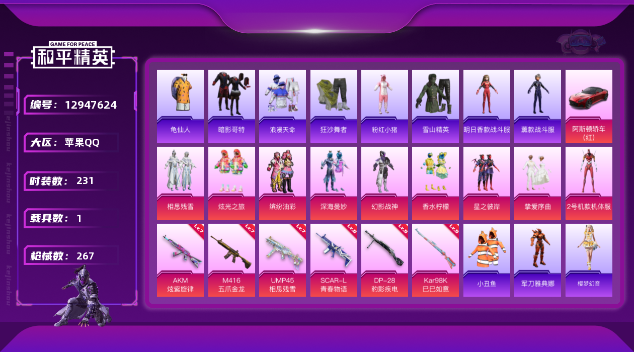 [12947624]无敌战神框1/绝世印记2【暑期末清货/特价急出/永久包赔】:苹果 手Q-10粉装-6特效枪-1载具-9.1w热力值-22印记-231套装-267枪皮【热门品类】:绝对防御上衣,套装-小丑鱼,套装-奇异狩猎者,角色-军刀雅典娜【稀有载具】:阿斯顿马丁DBS(红)【特效枪等级】:AKM-炫紫旋律(七级),SCAR-L-青春物语(六级),M416-五爪金龙(七级),UMP45-相思残雪(七级),Kar98K-巳巳如意(五级),DP-28-豹影疾电(五级)【优质套装】:粉装-深海曼妙,粉装-幻影战神,粉装-梦幻火箭,粉装-缤纷油彩,粉装-香水柠檬,粉装-星之彼岸,粉装-相思残雪,角色-2号机款机体服,粉装-挚爱序曲,粉装-炫光之旅【优质飞行器】:梦幻火箭飞行器,甜蜜誓约飞行器
