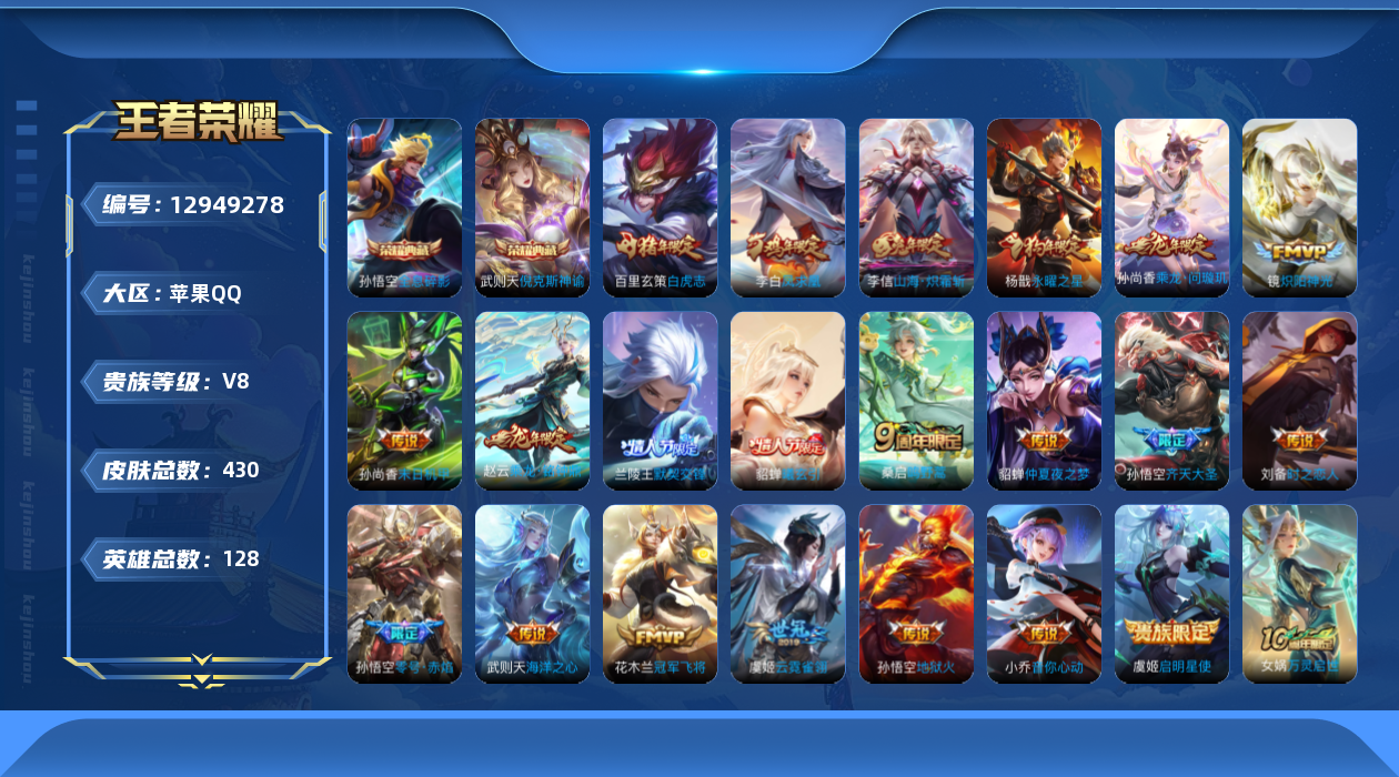 [12949278]【特价急出/详情看图】:苹果Q-V8-荣耀黄金IV段位-126英雄-426皮肤-2典藏-21传说-121史诗 【荣耀典藏】:武则天英雄,孙悟空全息碎影,武则天倪克斯神谕 【传说皮肤】:桑启鸣野蒿,貂蝉曦玄引,孙尚香乘龙问璇玑,赵云乘龙铭钟鼎,孙悟空齐天大圣,李信山海炽霜斩,小乔音你心动,兰陵王默契交锋,镜炽阳神光,虞姬启明星使,孙悟空零号赤焰,刘备时之恋人,虞姬云霓雀翎,百里玄策白虎志,花木兰冠军飞将,杨戬永曜之星,貂蝉仲夏夜之梦,李白凤求凰,孙尚香末日机甲,孙悟空地狱火,武则天海洋之心 【限定皮肤】:白起狰,蔡文姬夏日便利店,大乔绒语心约,虞姬夏日便利店,杨戬破阵退雄兵,狄仁杰阴阳师,赵云皇家上将,墨子神迹守卫,妲己时之彼端,嬴政白昼王子,孙尚香蔷薇恋人,鲁班七号狮舞东方,高渐离玩趣恶龙,阿轲迷踪丽影,钟无艳超时空战士,扁鹊奇幻香踪,白起夜都怪侠,芈月重明,芈月白晶晶,芈月幻夜卜梦,吕布猎兽之王,周瑜赤莲之焰,元歌云间偶戏,元歌无心,夏侯惇朔风刀,甄姬游园惊梦,甄姬落雪兰心,曹操烛龙,典韦穷奇,典韦蓝屏警告,马可波罗逐梦之星,马可波罗暗影游猎,狄仁杰魔术师,狄仁杰万华元夜,达摩星际陆战队,达摩沙漠行僧,项羽海滩派对,老夫子醍醐杖,关羽冰锋战神,程咬金演武夺筹,露娜一生所爱,刘邦夺宝奇兵,韩信逐梦之影,韩信飞衡,王昭君午后时光,兰陵王默契交锋,兰陵王驯魔猎人,兰陵王金庭之子,花木兰默契交锋,亚瑟潮玩骑士王,孙悟空美猴王,孙悟空至尊宝,孙悟空大圣娶亲,孙悟空零号赤焰,孙悟空孙行者,孙悟空齐天大圣,牛魔御旌,后羿辉光之辰,李元芳银河之约,李元芳云中旅人,虞姬启明星使,钟馗神迹守卫,钟馗驱傩正仪,杨玉环遇见飞天,杨戬永曜之星,杨戬潮玩骑兵,女娲朔望之晖,哪吒逐梦之翼,干将莫邪胡桃夹子,雅典娜单词大作战,蔡文姬繁星吟游,太乙真人饕餮,鬼谷子原初探秘者,鬼谷子五谷丰年,黄忠火炮绅士,百里玄策白虎志,百里守约朱雀志,弈星混沌棋,公孙离蜜橘之夏,沈梦溪星空之诺,沈梦溪大漠名商,明世隐疑决卦,明世隐吟游魔法,裴擒虎李小龙,裴擒虎擒涛扼浪,狂铁御狮,狂铁电玩高手,米莱狄御霄,米莱狄胡桃异想国,云中君纤云弄巧,李信山海炽霜斩,盾山御銮,猪八戒西部大镖客,上官婉儿梁祝,上官婉儿天狼绘梦者,嫦娥拒霜思,嫦娥暖冬兔眠,西施玲珑珍味,蒙犽狂想玩偶喵,鲁班大师探海日志,桑启海盐诗旅,暃星界游侠
