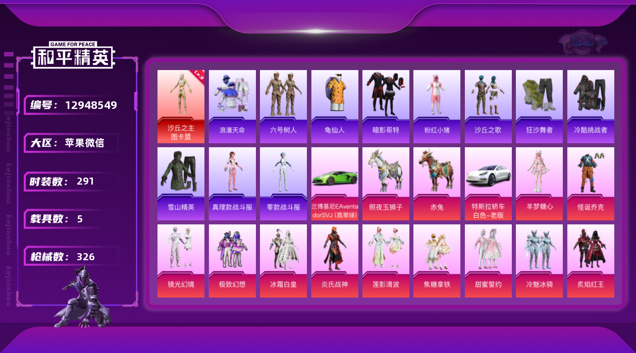 [12948549]无敌战神框1/SCAR-L-天蓬元帅(九级)【特价急出/详情看图】:苹果 微信-无敌战神框-1红装-27粉装-15特效枪-5载具-6粉色飞行器-13.3w热力值-23王牌印记-291套装-326枪皮【红色神装等级】:沙丘之主-图卡盟(三级)【热门品类】:粉装-怪诞乔克,粉装-雪国幻梦,粉装-梦幻火箭,绝对防御上衣,套装-浪漫天命,套装-赤蝎幽灵,套装-都市猎人,套装-派对舞王,套装-深海小丑鱼,套装-小丑鱼,套装-奇异狩猎者,套装-胖达团团,套装-胖达圆圆,套装-金羽特工,角色-忠猛周仓,角色-忠真马岱,角色-忠义严颜,套装-六号树人,套装-龟仙人,套装-潮萌小黄鸭,套装-暗影哥特,套装-浪漫波比,套装-粉红小猪,小丑红鼻头,大砍刀-青龙偃月刀,撬棍-龙胆亮银枪【粉色载具】:特斯拉Model 3(珍珠白),兰博基尼Aventador SVJ(翡翠绿),僚机-萌兔起飞,赤兔,照夜玉狮子【粉色套装】:粉装-数码大师,粉装-怪诞乔克,粉装-雪国幻梦,粉装-梦幻火箭,粉装-金风玉露,粉装-放客神游,粉装-新星烈龙,粉装-甜蜜誓约,粉装-极致幻想,粉装-银刃赛罗,粉装-冰霜白皇,粉装-炙焰红王,粉装-星之彼岸,角色-2号机款机体服,粉装-焦糖拿铁,粉装-碧影闪光,粉装-冷魅冰骑,粉装-赤焰黑爵,粉装-第五大道,粉装-炎氏战神,角色-猩猩队长,粉装-莲影清波,粉装-暖暖奶龙,粉装-镜光幻境,角色-圣堂之誓,角色-樱桃泡泡,角色-羊梦糖心【粉色枪皮等级】:AKM-炫紫旋律(五级),SCAR-L-青春物语(一级),SCAR-L-天蓬元帅(九级),SCAR-L-纯梦嫁纱(二级),M416-五爪金龙(七级),M416-心之恋语(一级),M416-超新星(四级),AUG-南国舞曲(六级),M762-激战未来(七级),Vector-环太平洋(三级),P90-能量风暴(一级),P90-沙丘之主(三级),Kar98K-巳巳如意(五级),DP-28-圣堂之誓(一级),DP-28-豹影疾电(四级)【粉色飞行器】:星之彼岸飞行器,齐天大圣飞行器,闪光银龙飞行器,沙丘之主天马