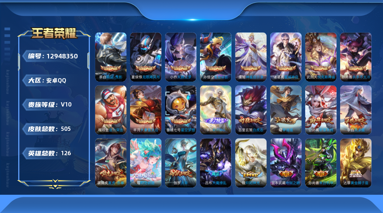 - [12298302]V8 2典藏 1无双 1珍品传说 18传说 124英雄 329皮肤 可修改实名 优质装备:鸣剑·曳影,全息碎影(猴子典藏),碎月剑心(李白无双),云鹰飞将(小将军),久胜战神,一念神魔,末日机甲-孙尚香(绿蚂蚱),时之恋人-刘备(电焊工),淬星耀世,挚爱之约,山海·炽霜斩(李信年限),妄想实况,澜逐花归海 珍品传说:兔狲·蓬尾 传说皮:幻光神枪 珍宝阁皮:万物之道,优雅恋人,蔷薇恋人,玩趣恶龙 限定皮:鸣野蒿,至尊宝,凤求凰(白切鸡),梅西,武陵仙君(小桃花),傲雪梅枪,时雨天司(水龙头),神威(电光马子),飞衡(韩信年限),高山流水,诗剑行,匿光决锋者,五谷丰年,梁祝,李小龙,辉光之辰,默契交锋-花木兰,孙行者,一生所爱,大圣娶亲,青春决赛季,枫霜尽,山海·玄木吟(马可年限) 史诗皮:鸭鸭历险记-刘禅,器灵·浮梦炉,星界战将,龙之律动,石田雨龙,茶境仙,破空之剑,决胜骁骑,织梦人,紫霞仙子,苍穹之光,电玩小子(小书包),白龙吟,黄金分割率,特工魅影,千年之狐,永昼,江河有灵,魅语,蒙恬荣光圣徽,无限星赏官,冰冠公主,偶像歌手,暗夜猫娘,末日机甲-吕布,猫狗日记-孙策,猫狗日记-大乔,乱世虎臣,节奏热浪,修罗,女仆咖啡,摇滚巨星,水果甜心,天才门将,星夜王子,心灵骇客,功夫厨神,德古拉伯爵,暗隐猎兽者,幽灵船长,鬼剑武藏,心灵战警,乐园奇幻夜,舞动绿茵,地狱岩魂,纤云弄巧,缤纷独角兽,乘风破浪,逐浪之夏,月团寄思,水晶猎龙者,金属风暴,原初追逐者,圣诞狂欢,圣诞恋歌,鹰眼统帅,暗夜贵公子,魅力维加斯,黎明之约,无心,未来纪元-赵云