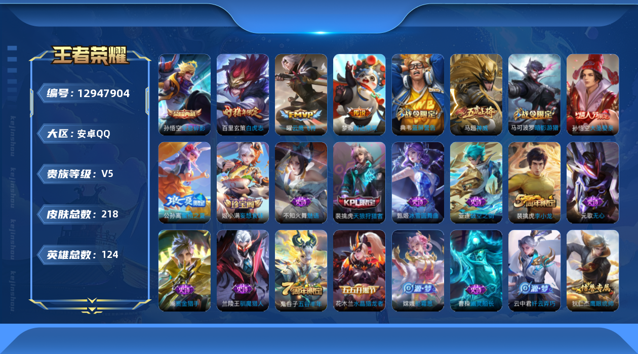 [12947904]安卓Q-V5-永恒钻石III段位-124英雄-218皮肤-1典藏-3传说-52史诗