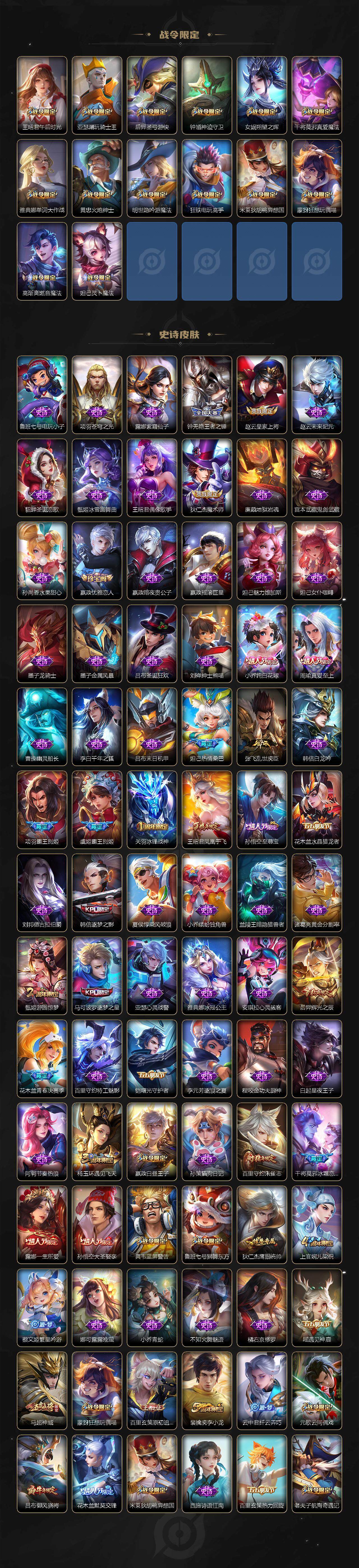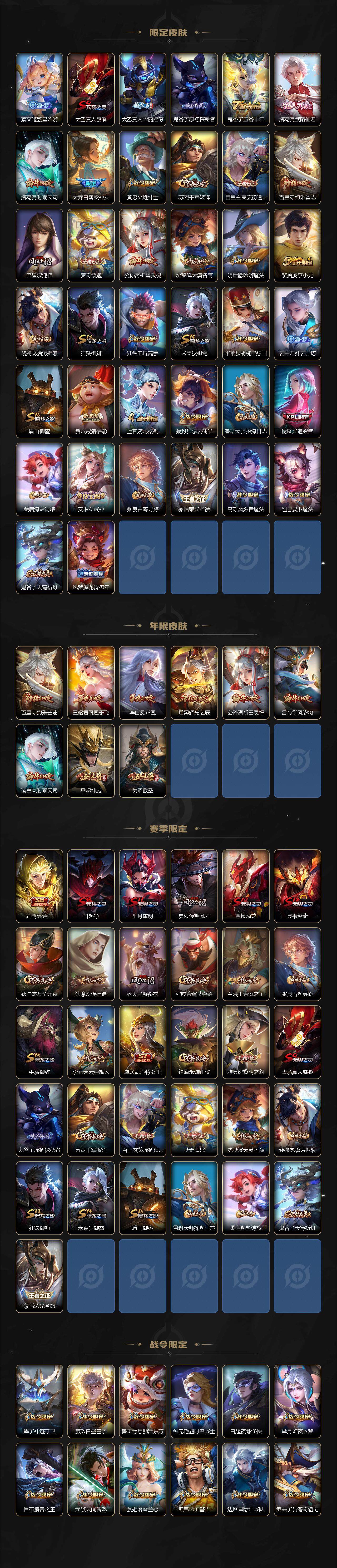 【限定皮肤】:白起狰,狄仁杰阴阳师,小乔纯白花嫁,虞姬凯尔特女王,赵云皇家上将,墨子神迹守卫,妲己热情桑巴,嬴政优雅恋人,嬴政白昼王子,孙尚香异界灵契,鲁班七号狮舞东方,庄周高山流水,高渐离死亡摇滚,钟无艳王者之锤,钟无艳超时空战士,扁鹊炼金王,白起夜都怪侠,芈月重明,芈月幻夜卜梦,吕布猎兽之王,吕布御风骁将,周瑜真爱至上,元歌云间偶戏,夏侯惇朔风刀,甄姬游园惊梦,甄姬落雪兰心,曹操烛龙,典韦穷奇,典韦蓝屏警告,马可波罗逐梦之星,狄仁杰魔术师,狄仁杰万华元夜,达摩星际陆战队,达摩沙漠行僧,项羽海滩派对,项羽霸王别姬,老夫子醍醐杖,老夫子航海奇遇记,关羽冰锋战神,关羽武圣,程咬金演武夺筹,露娜一生所爱,韩信逐梦之影,王昭君凤凰于飞,王昭君午后时光,兰陵王金庭之子,花木兰青春决赛季,花木兰默契交锋,亚瑟潮玩骑士王,孙悟空至尊宝,孙悟空大圣娶亲,孙悟空孙行者,牛魔御旌,后羿辉光之辰,后羿圣弓游侠,李元芳云中旅人,虞姬霸王别姬,虞姬启明星使,钟馗神迹守卫,钟馗驱傩正仪,杨玉环遇见飞天,女娲朔望之晖,干将莫邪冰霜恋舞曲,干将莫邪真爱魔法,雅典娜单词大作战,雅典娜黎明之约,蔡文姬繁星吟游,太乙真人饕餮,太乙真人华丽摇滚,鬼谷子原初探秘者,鬼谷子五谷丰年,诸葛亮武陵仙君,诸葛亮时雨天司,大乔白鹤梁神女,黄忠火炮绅士,苏烈千军破阵,百里玄策原初追逐者,百里守约朱雀志,弈星混沌棋,梦奇顽趣,公孙离祈雪灵祝,沈梦溪大漠名商,明世隐吟游魔法,裴擒虎李小龙,裴擒虎擒涛扼浪,狂铁御狮,狂铁电玩高手,米莱狄御霄,米莱狄胡桃异想国,云中君纤云弄巧,盾山御銮,猪八戒猪悟能,上官婉儿梁祝,蒙犽狂想玩偶喵,鲁班大师探海日志,镜匿光追影者,桑启海盐诗旅,艾